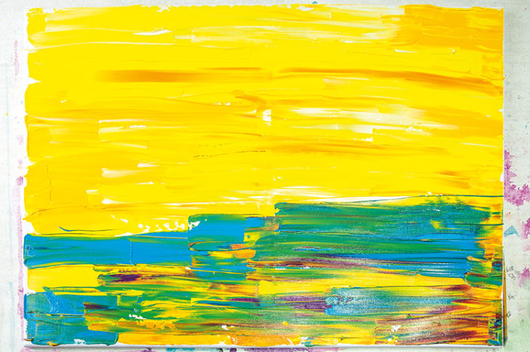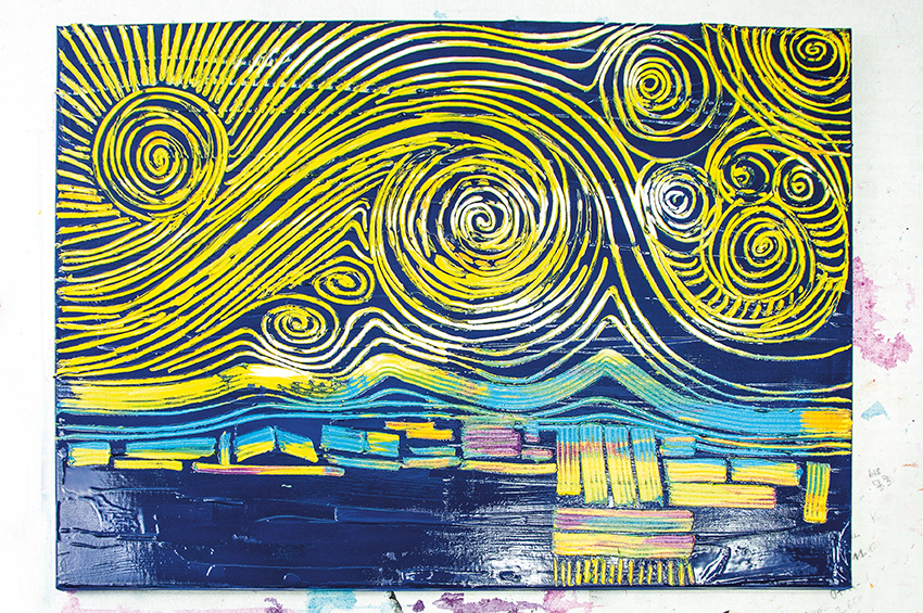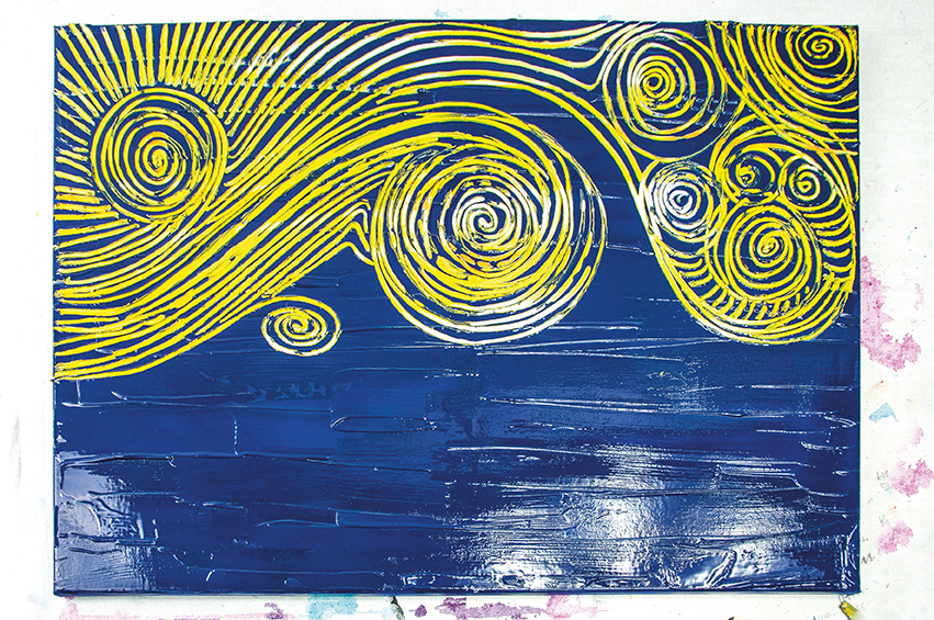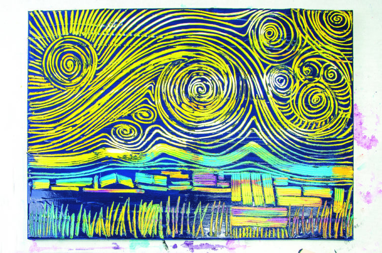 Beim Acrylic-Scratch wird die Acrylfarbe grob auf eine Leinwand aufgetragen, mit Artist Acryl Spray großflächig wieder übersprüht und dann wird das gewünschte Motiv ausgekratzt. So kommen effektvolle Motive in prachtvollen Farbwelten zum Vorschein. Bei diesem Kunstwerk lässt sich ein Hauch von Vincent van Goghs Sternennacht kaum übersehen.
