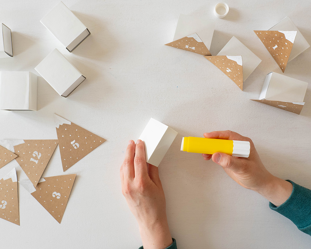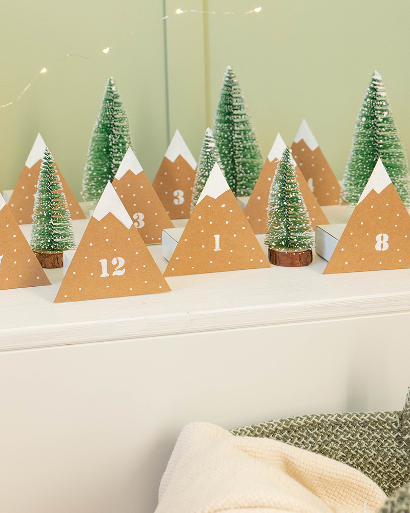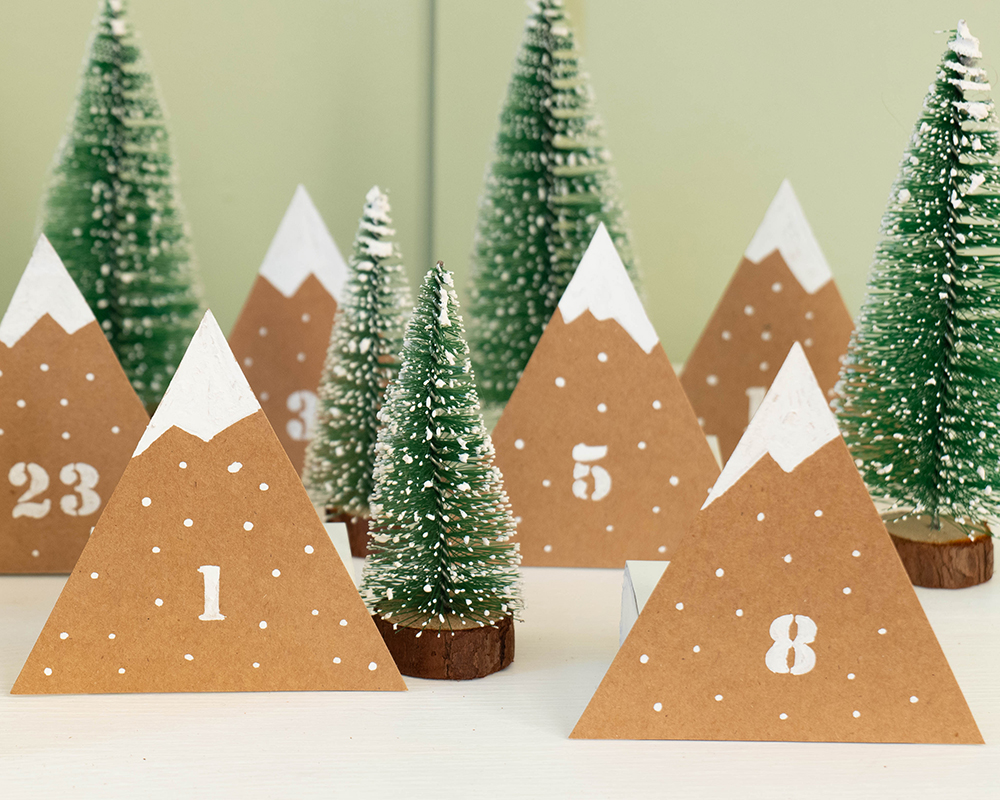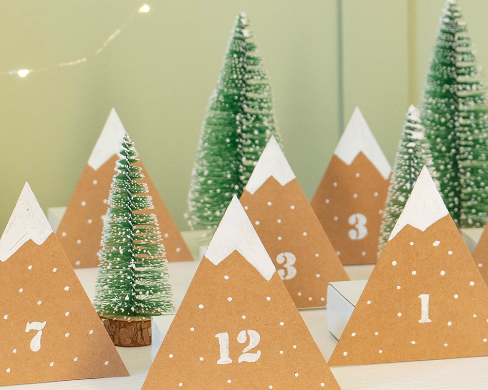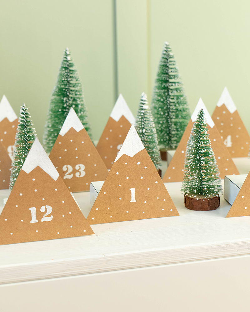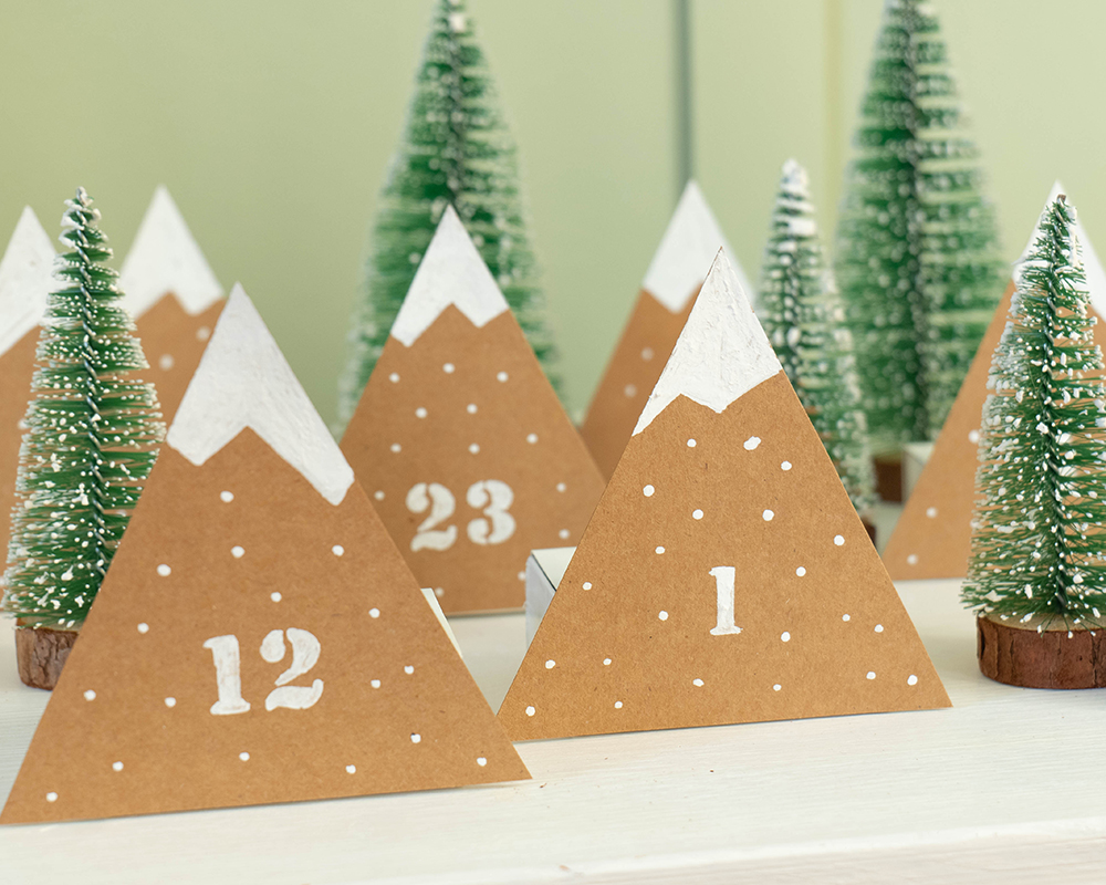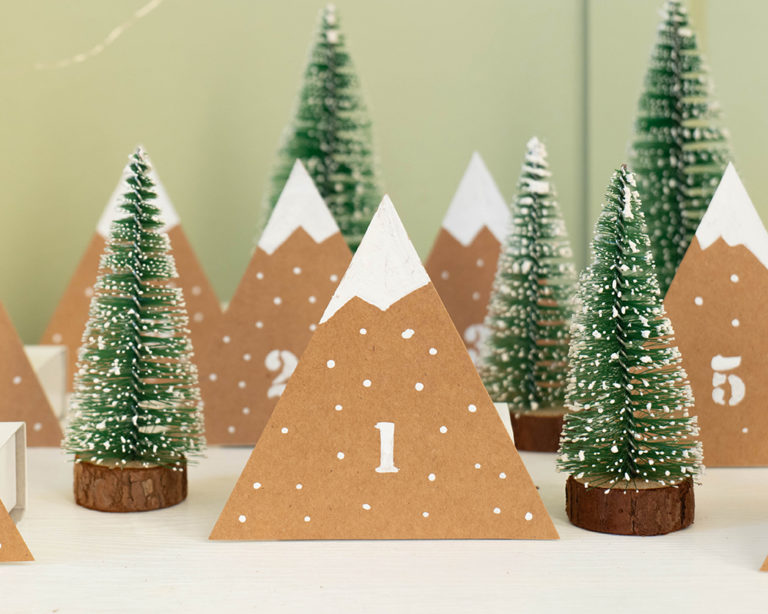 So ein Adventskalender aus kleinen Bergen ist schnell selbstgemacht und sieht auch noch dekorativ gut aus. Einfach 24 Karton-Dreiecke mit dem YONO Marker in schneebedeckte Gipfel verwandeln, kleine Schachteln ankleben, befüllen und verschenken. Fertig ist die Überraschung!