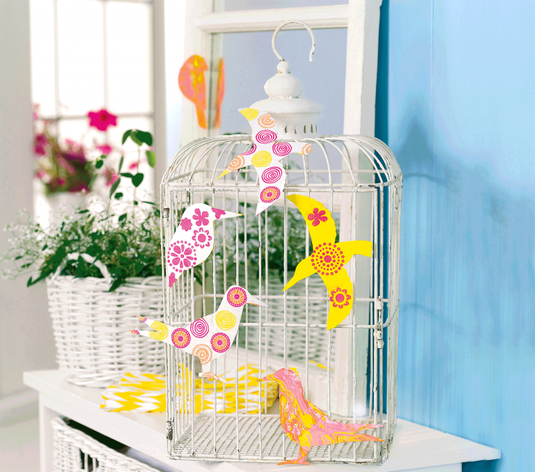 Die aus schlicht-weißem Fotokarton hergestellten Vögel erhalten mithilfe verschiedener Kreativtechniken, wie Serviettentechnik, Marmorieren oder Schablonieren, ein prachtvolles Gefieder. An einen dekorativen Vogelkäfig drapiert oder in frischen Frühlingszweigen sind sie ein bunter Blickfang für jeden Raum!