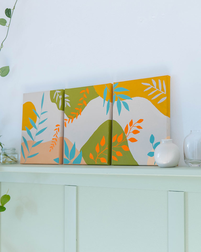 Frisch und schwungvoll präsentieren sich die drei Keilrahmen und bilden zusammen ein harmonisches Kunstwerk auf dem Sideboard. Mit einfachen Formen und Motiven gelingt dieses Trio garantiert!