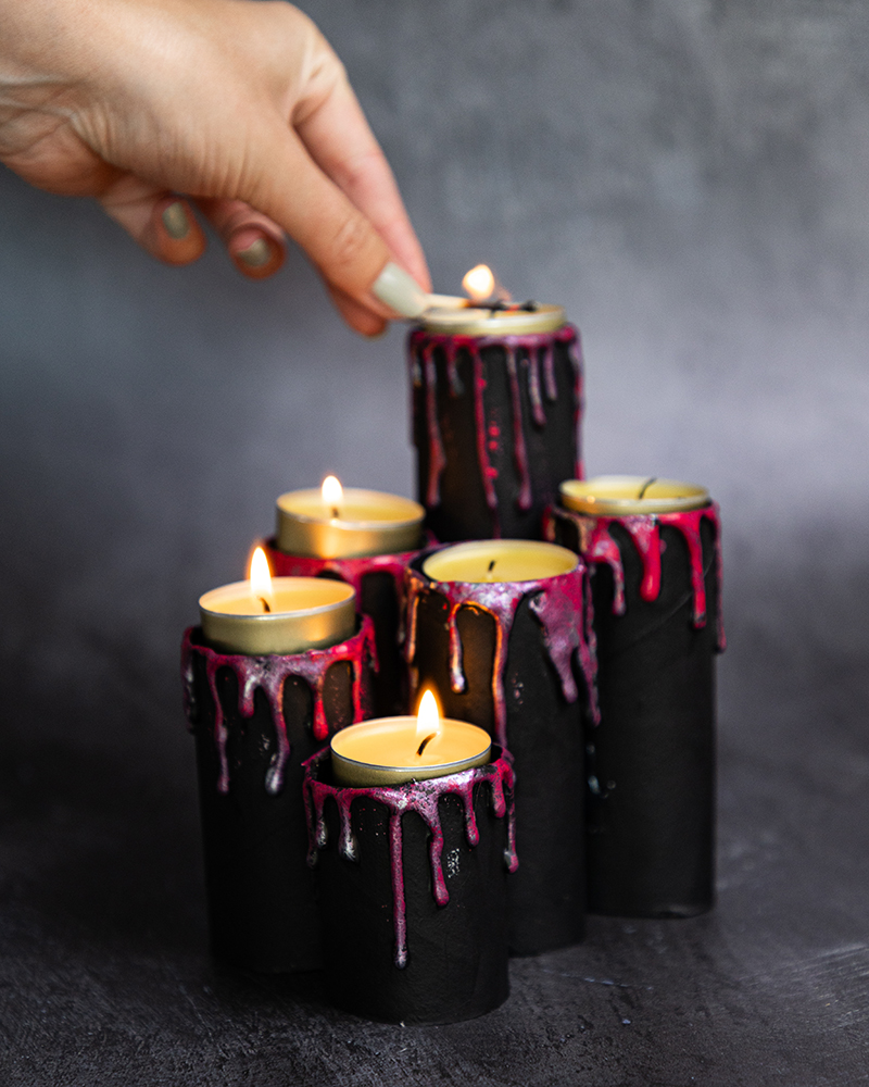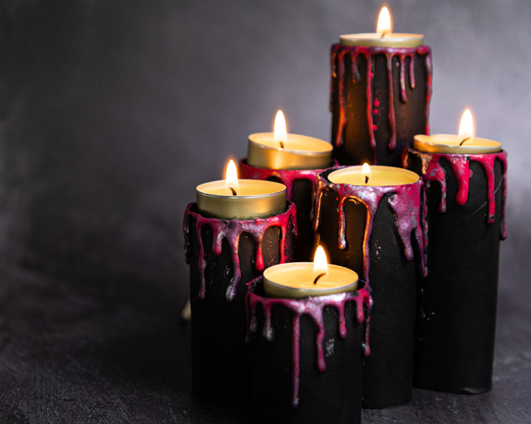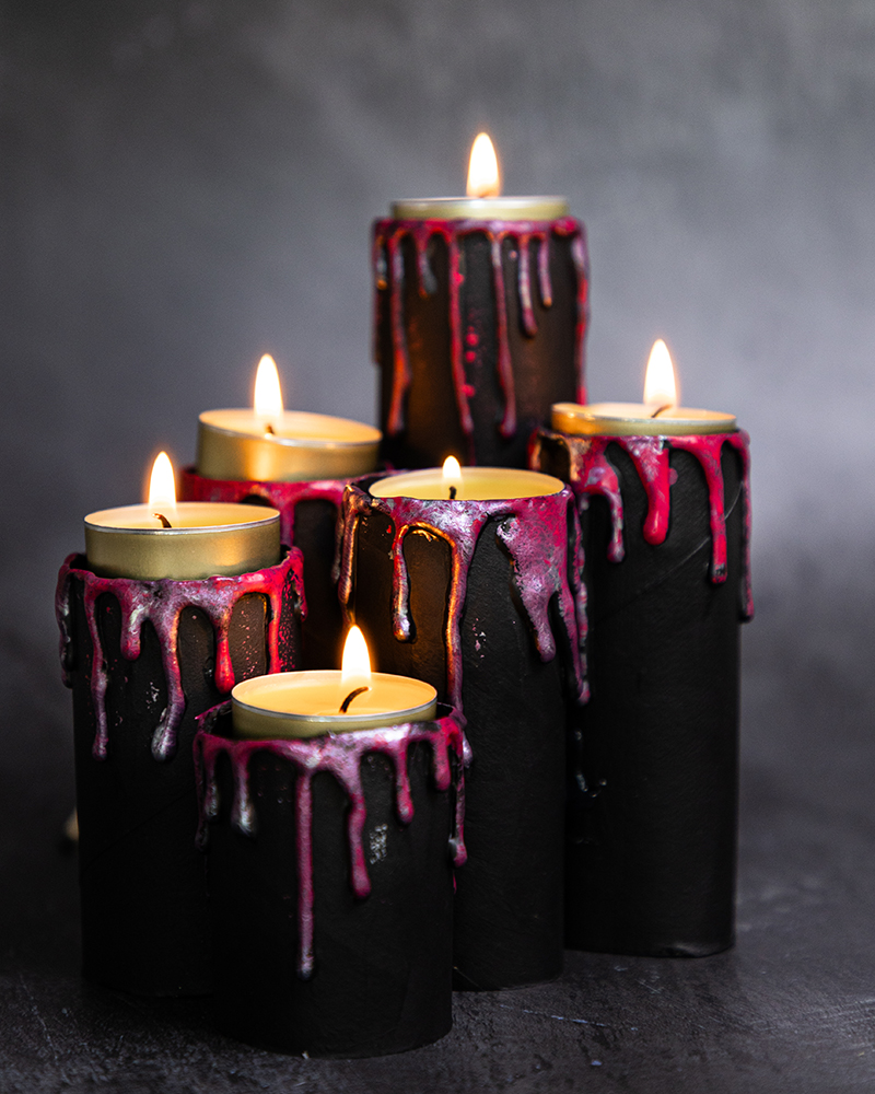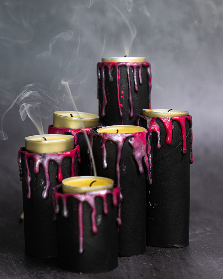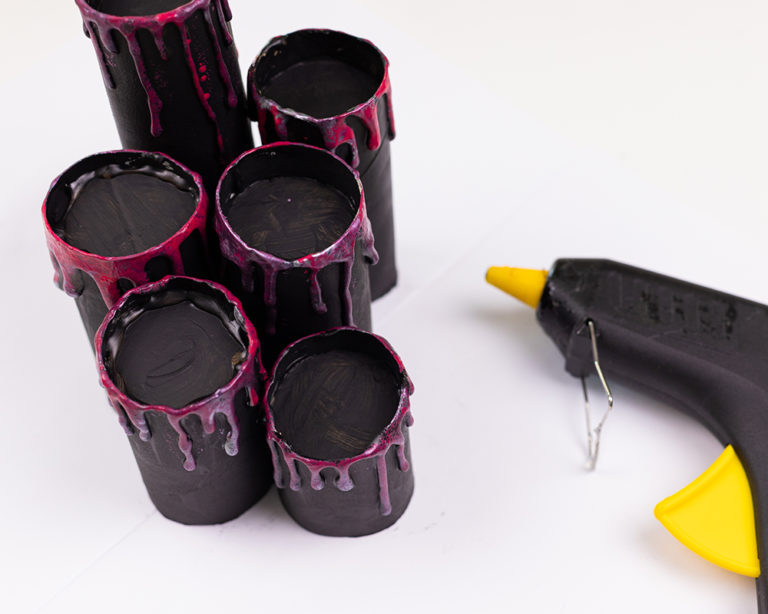 • Sobald die Farbe trocken ist, können die verschiedenen Papprollen-Kerzen mit Heißkleber zu einer Formation zusammen geklebt werden. In die Mulden werden noch Teelichter gestellt und die Halloween-Deko ist fertig!