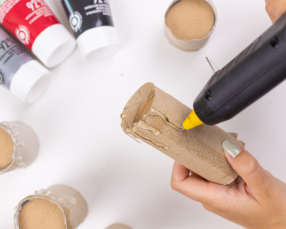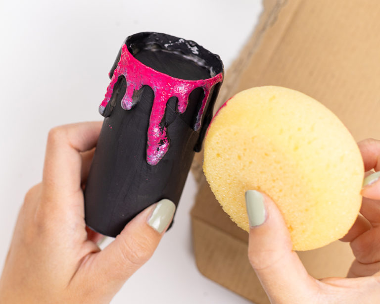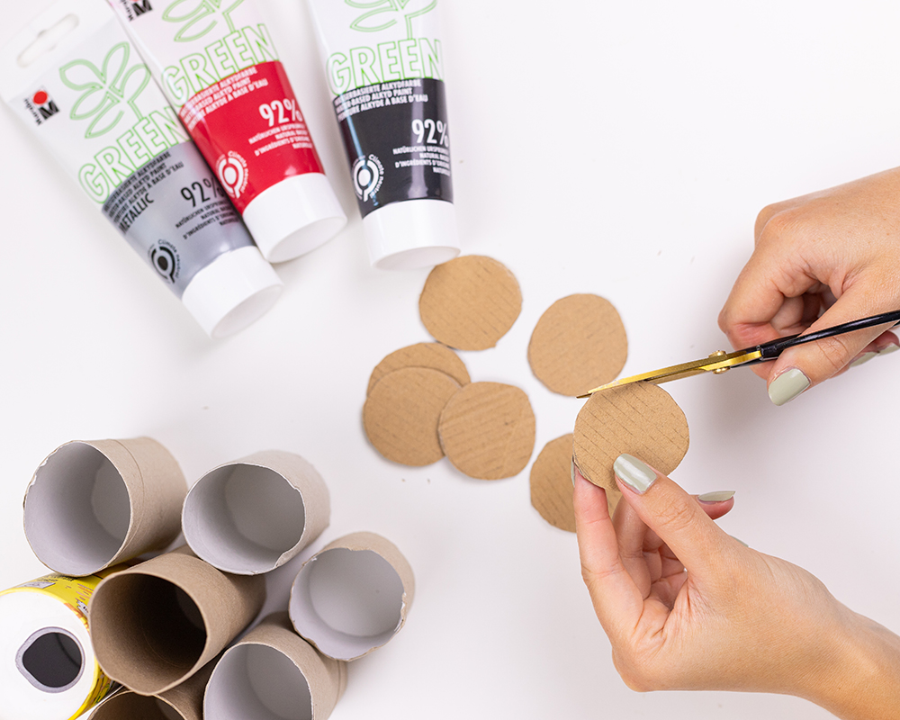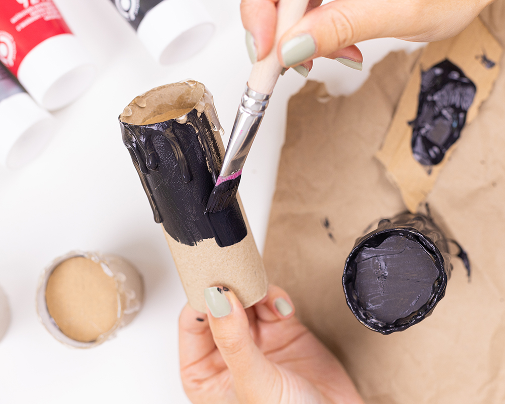 • Die Papprollen von außen und von innen mit der GREEN Alkydfarbe in Schwarz bemalen und trocknen lassen.