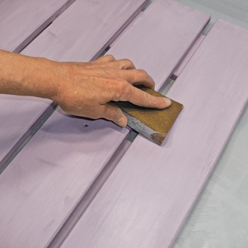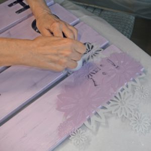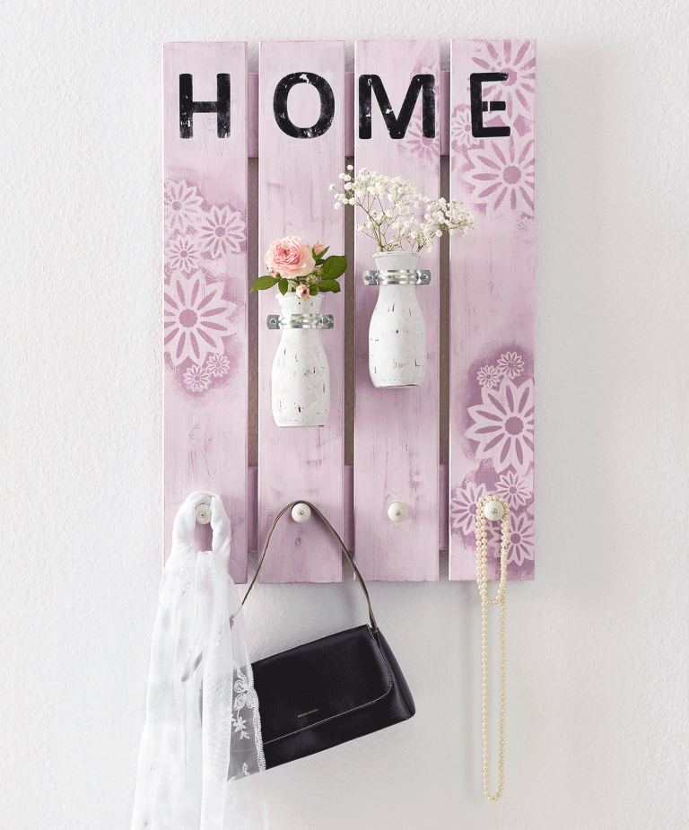 Ein Holzboard wurde hier mit Schablonen, ausgefallenen Blumenvasen und Kreidefarben in sanften Farbtönen zu einer stylischen Garderobe.