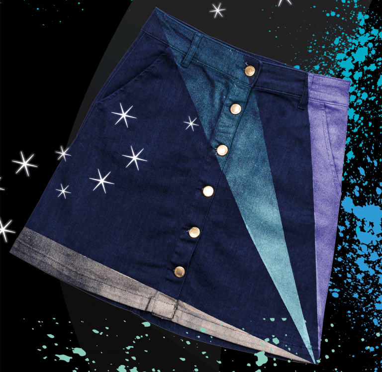 Zum besonderen Eyecatcher mit Schimmer-Effekt wird der schlichte, dunkelblaue Jeans-Rock mit Fashion-Shimmer. Die Textilsprühfarbe entfaltet ihren besonderen Effekt vor allem auf dunklen Textilien und bringt sie so zum Strahlen. Das Jeans-Outfit wird mit Hilfe der Abklebetechnik im Nu zum individuellen Lieblings-Kleidungsstück.