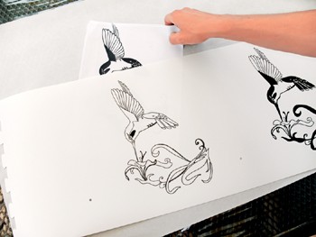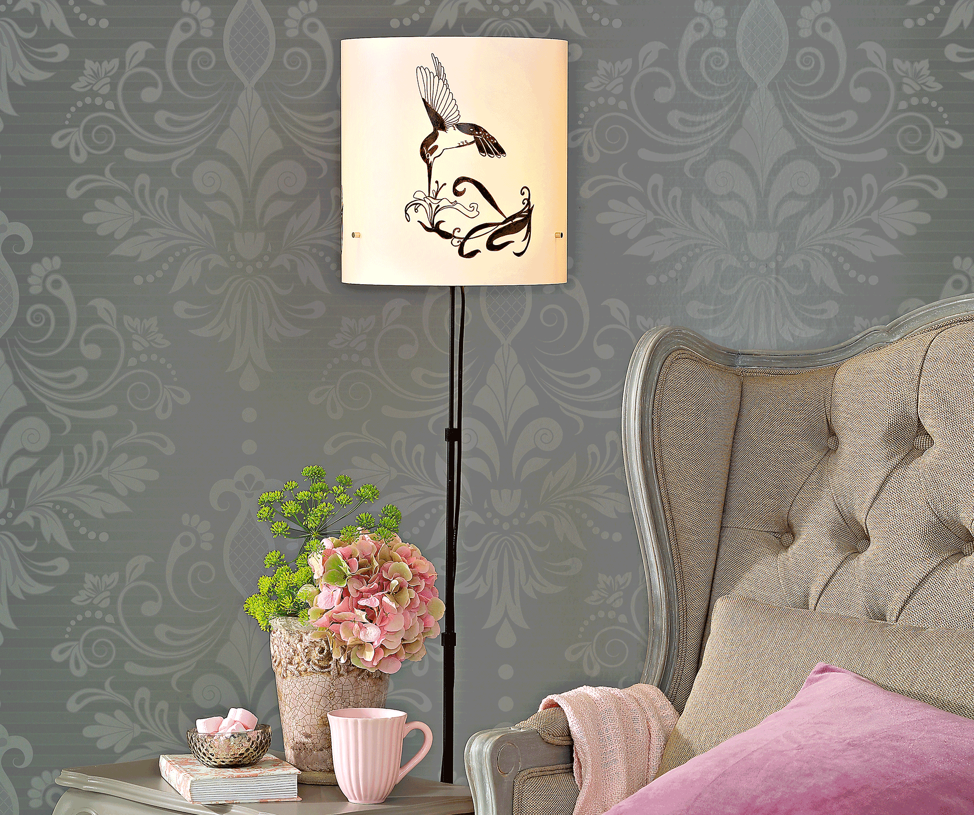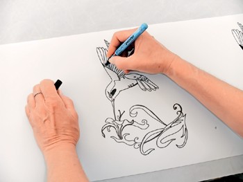 Die Vorlage für den Kolibri von hinten unter die Lampenschirmfolie schieben.