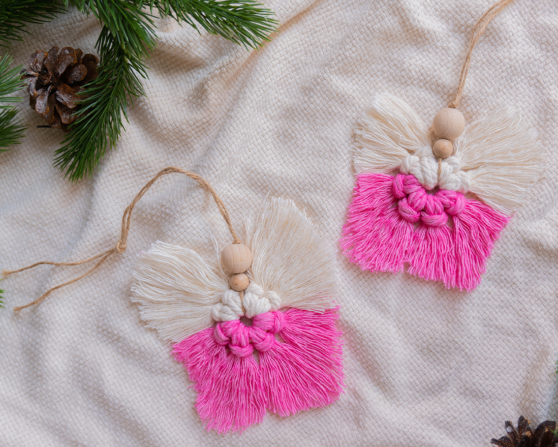 Zum Verschenken fast zu schön! Die kleinen Makramee-Engel eignen sich wunderbar als Geschenkanhänger, Schutzengel oder für die Weihnachtsdekoration. Ein bisschen Farbe erhalten die Süßen mit der Batikfarbe easy color.