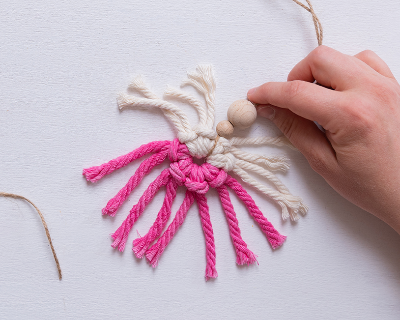 • Ist der Ring komplett mit Knoten versehen, etwas Jutegarn durch den Ring führen. Anschließend auf die beiden Enden zwei unterschiedlich große Holzperlen fädeln und mit einem Knoten fixieren.