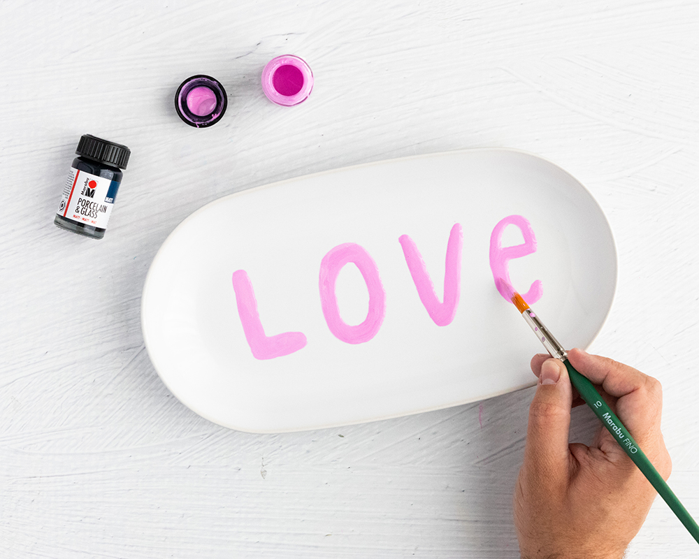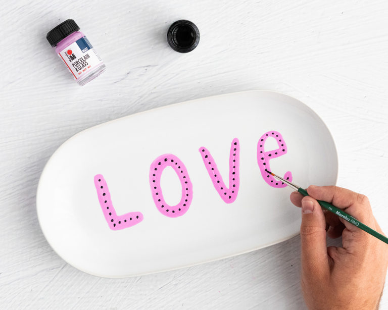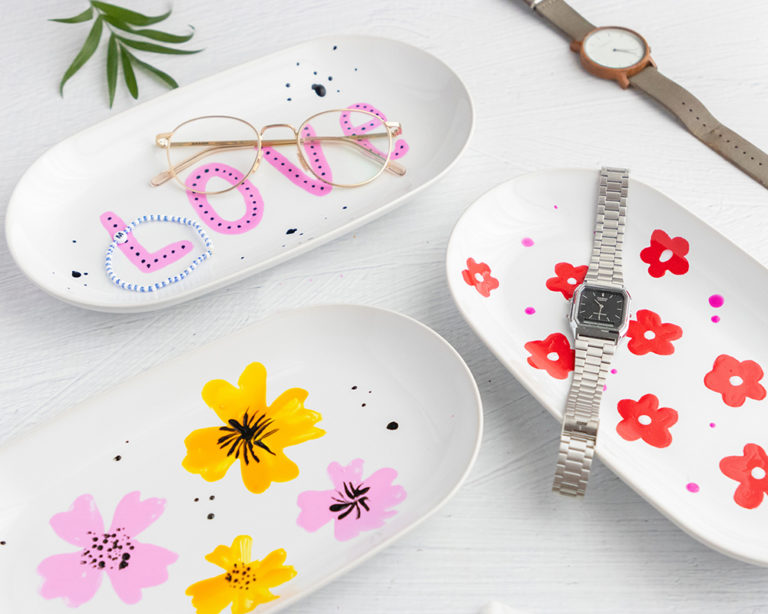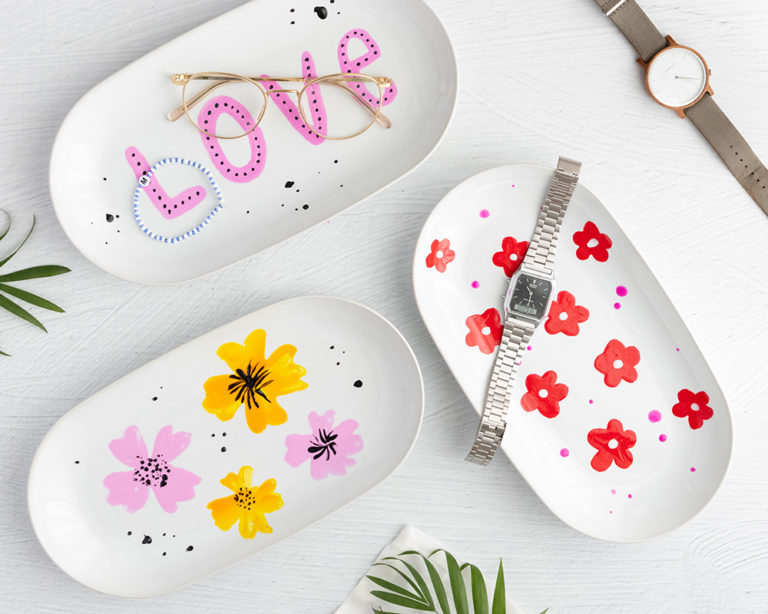 Aus einer einfachen Porzellan-Schale kann ganz schnell eine hübsche Schmuckschale werden. Die perfekte Ablage für den Lieblingsschmuck oder den Schlüssel – Wiederfinden garantiert.