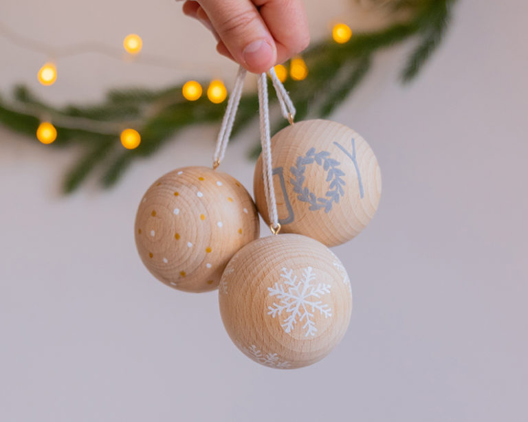 Weihnachtskugeln verschönern nicht nur den Weihnachtsbaum. Ganz einfach mit dem YONO Marker werden diese schlichten Holzkugeln zur dezenten Weihnachtsdekoration.