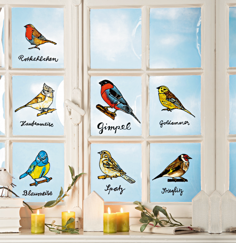 Der ein oder andere Vogel fliegt im Winter eigentlich lieber in den warmen Süden. Hier aber schmücken sie als Motive aus Window-Color-Farben das Fenster.