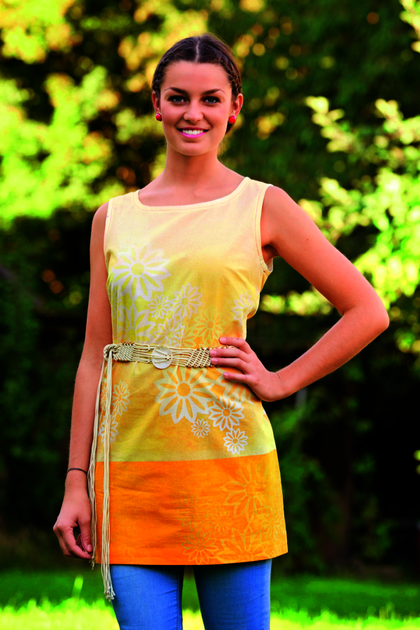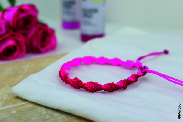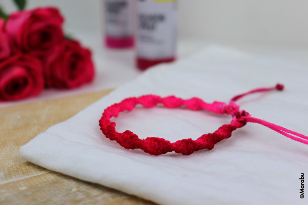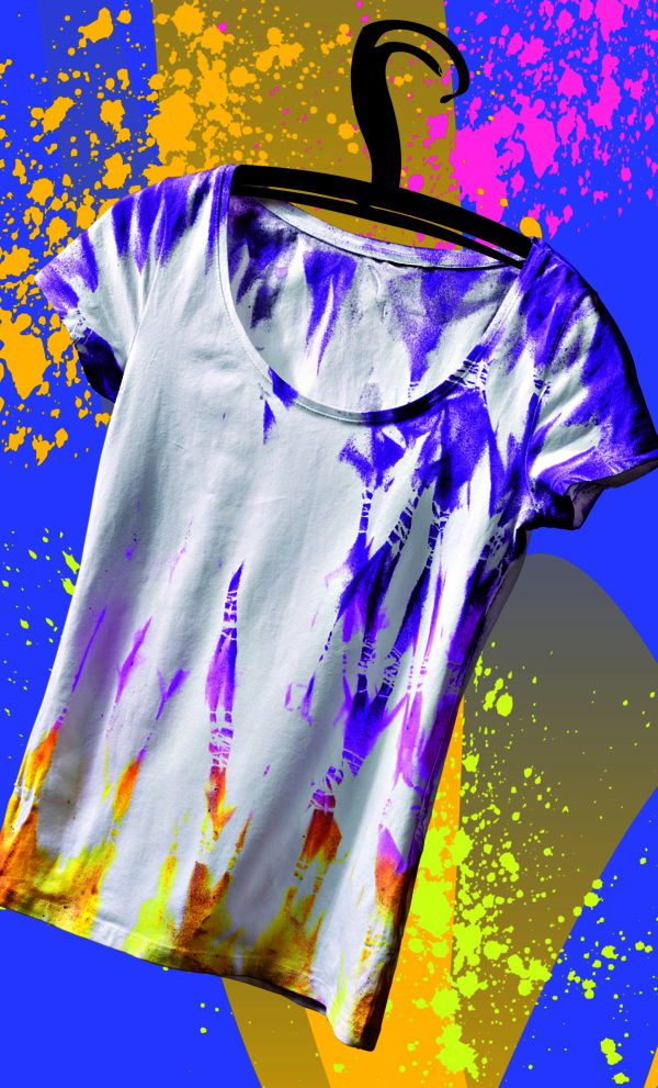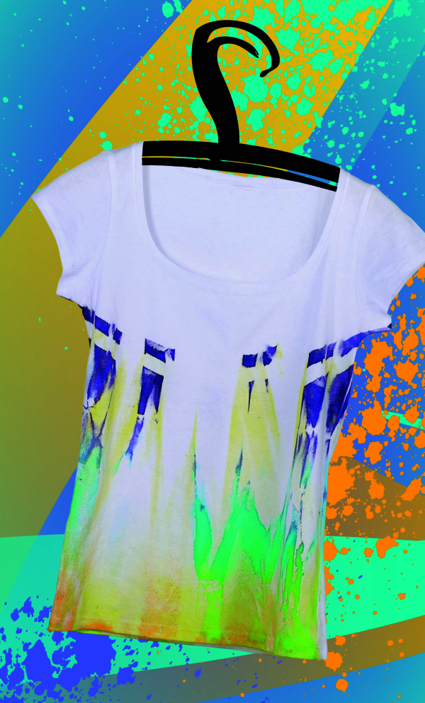 Abbinden mit Marabu Fashion-SprayBei Textilien (Baumwoll- und Mischgewebe bis max. 20 % Kunstfaseranteil) Appretur und Weichspüler auswaschen. Einzelne Partien eines T-Shirts o.ä. wie bei der Batiktechnik mit Garn umwickeln. Ggf. kann der obere Teil des Shirts mit Pappe abgedeckt und mit Klebeband auf der Unterlage straff befestigt werden. Dieser Bereich bleibt später weiß. Nun mit Fashion-Spray ein- oder mehrfarbig das Textil besprühen. Nach der Trocknung Garn lösen und Textil fixieren.