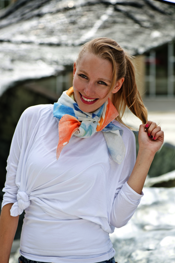 Twist-Technik mit Marabu Fashion-SprayBei Textilien (Baumwoll- und Mischgewebe bis max. 20 % Kunstfaseranteil) Appretur und Weichspüler auswaschen. Eindrucksvolle Effekte erzielen Sie mit der Twist-Technik. Textil mit Fashion-Spray besprühen und trocknen lassen. Danach den Stoff in der Mitte fassen und drehen, so dass sich eine Spirale ergibt. Nehmen Sie z.B. einen Kochlöffel zur Hilfe und drehen Sie den Stoff ein, bis eine Art "Brezel" entsteht. Mit einem anderen, dunkleren Farbton darüber sprühen und so weitere farbige Akzente setzen. Den gedrehten, eingesprühten Stoff eine Stunde liegen lassen. Danach auffalten und trocknen lassen, fertig! Für die Waschbeständigkeit bis 40°C das Tuch fixieren.