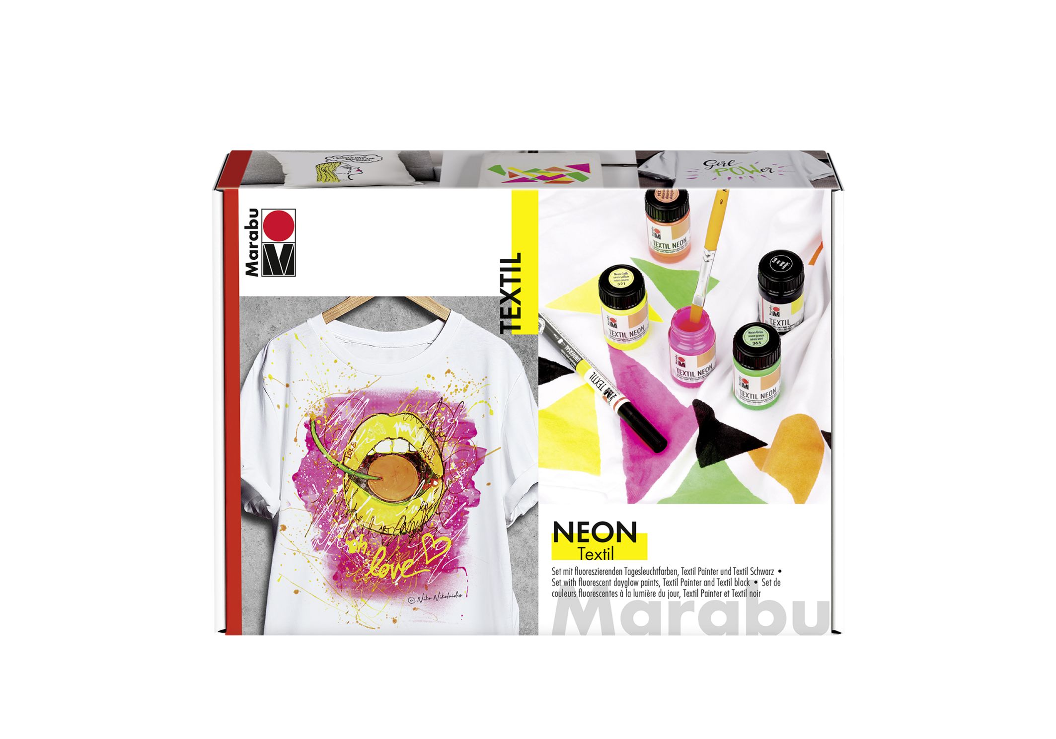 Textil NEON Set mit vier fluoreszierenden Tagesleuchtfarben. Zusätzlich sind im Set Textilfarbe in Schwarz und ein schwarzer Textil Painter enthalten, mit welchen die leuchtenden Designs weiter ausgestaltet werden können. 4 x 15 ml Neon Farbtöne in Neon-Gelb, -Orange, -Pink- und -Grün, Textil Schwarz 15 ml, Pinsel Größe 8, ein Textil Painter sowie eine Anleitung.