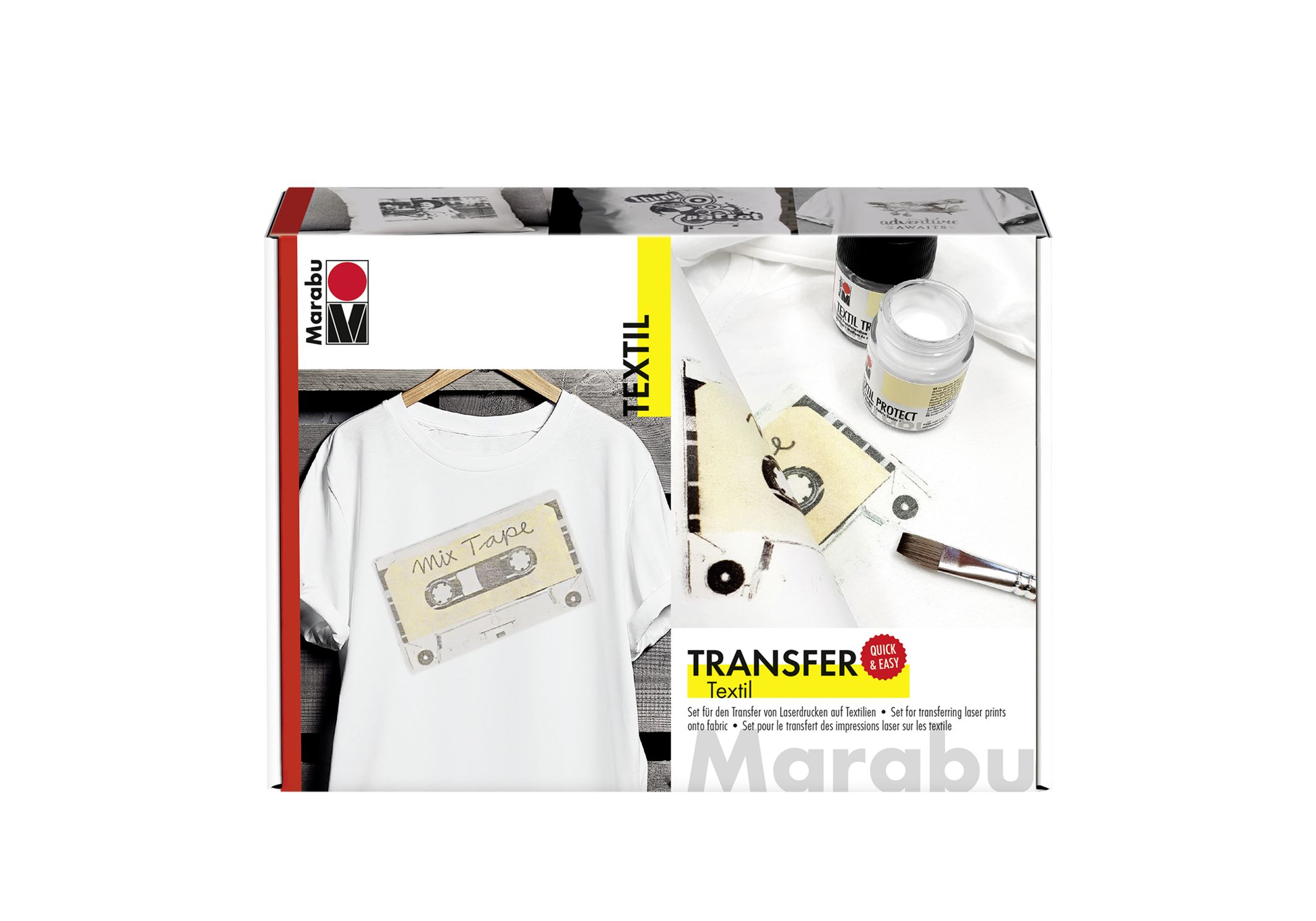 Marabu Transfer Textil Set mit allen notwendigen Medien und Werkzeugen für eine einfache und schnelle Gestaltung von Textilien mit Fotos, Motiven oder Logos die auf dem PC erstellt werden. Im Kompaktset enthalten sind Transfermedium auf Lösemittelbasis in 50 ml, Transfer Protect in 50 ml, Rakel, Pinsel Größe 16 und eine Anleitung.