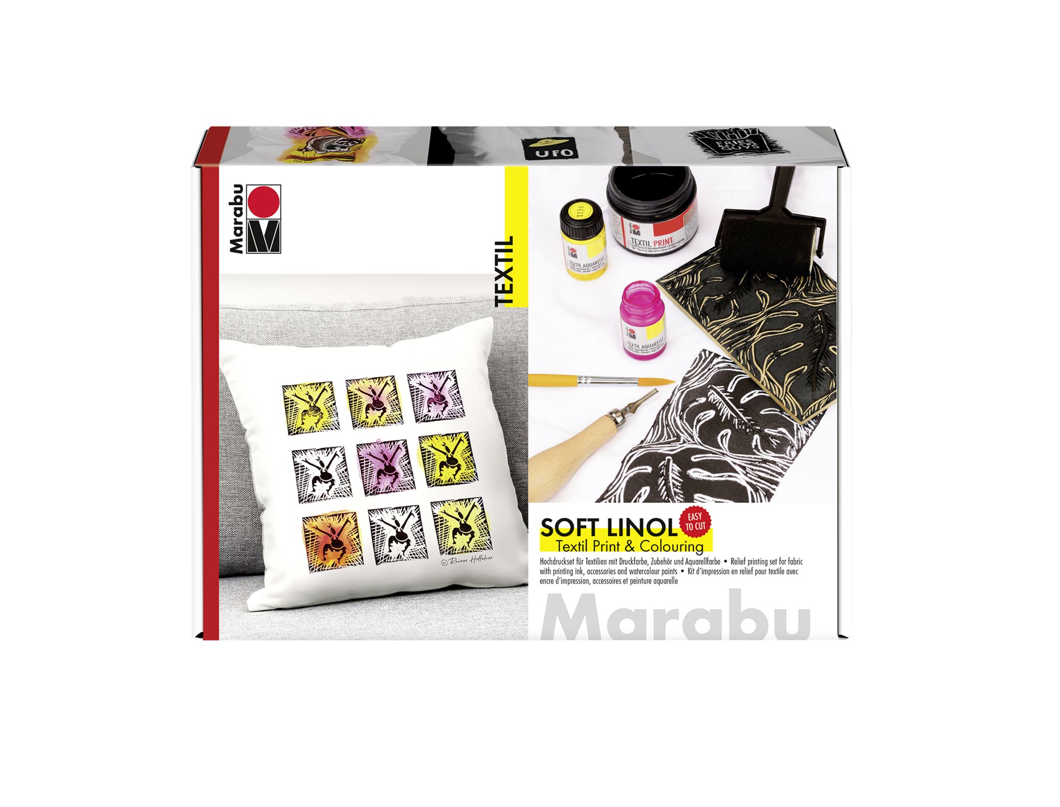 Linoldruck-Technik mit Marabu Textil Print – Textilien einfach, schnell und effektvoll in der Hochdrucktechnik bedrucken und vervielfältigen – das gelingt mit einer sorgfältigen Zusammenstellung an hochwertigen Farben, anwenderfreundlichen Werkzeugen und Hilfsmitteln. Eine eigene Motivwelt erstellen und damit Gestaltungen ermöglichen, die vorher undenkbar waren. Das individuelle Motiv wird mit Hilfe von Transferpapier und Bleistift auf die Softdruckplatte übertragen und anschließend mit dem Schneidewerkzeug bearbeitet. Im Hochdruck sind die druckenden Teile der Druckform erhaben. Der Geißfuß eignet sich für dünne Linien, mit dem großen Flachausheber können breite Linien und große Flächen geschnitten werden. Die Softdruckplatte ist dank ihrer Weichheit besonders leicht zu schneiden und zu bearbeiten. Das Motiv wird spiegelverkehrt gedruckt. Das ist vor allem dann wichtig, wenn mit Schrift gearbeitet wird. Textil Print wird mit dem Schaumroller gleichmäßig dünn auf die Erhebungen der Druckplatte gewalzt und dann sauber auf den Stoff abgedruckt. Anschließend die Druckplatte einfach mit Wasser reinigen oder für einen neuen Druckvorgang verwenden. Das Motiv kann reproduziert und das eigene Design in Serie angefertigt werden. Mit Textil Aquarelle kann der Druck anschließend coloriert und weiter gestaltet werden – eine Anwendungsmöglichkeit, die es nur bei Marabu gibt!