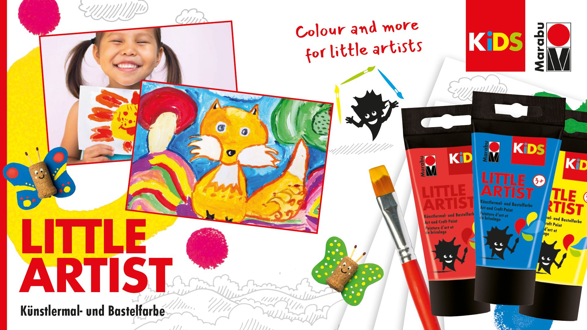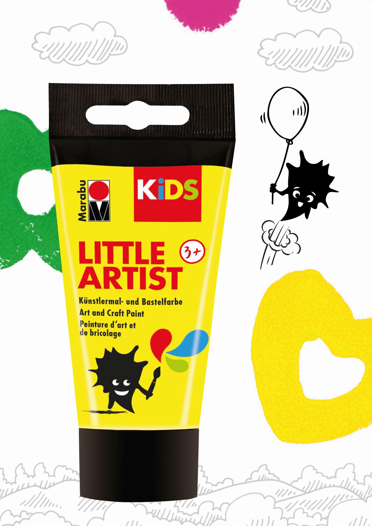 Jedes Set überzeugt mit Marabu KiDS LITTLE ARTIST, der Künstler-Mal- und Bastelfarbe für mal- und bastelfreudige Kinder ab 3 Jahren. Die kleinen Künstler sind den Fingerfarben entwachsen, aber für Acrylfarben ist es noch zu früh. Mit der KiDS LITTLE ARTIST Künstler-Mal- und Bastelfarbe können die Kleinen malen wie die Großen, aber genauso gut Basteln und natürlich Experimentieren, Mischen, Kleckern und Klotzen. Da darf auch mal was daneben gehen! Ein großer Pluspunkt gegenüber Acrylfarbe: Die LITTLE ARTIST Künstlermal- und Bastelfarbe lässt sich zeitnah aus den meisten Textilien ab 30°C auswaschen. Die wasserbasierte Farbe bietet Sicherheit in jeglicher Hinsicht. Sie ist hochpigmentiert, vegan, gluten- und parabenfrei. Und die Rezeptur kommt ohne Einsatz von Mikroplastik aus.