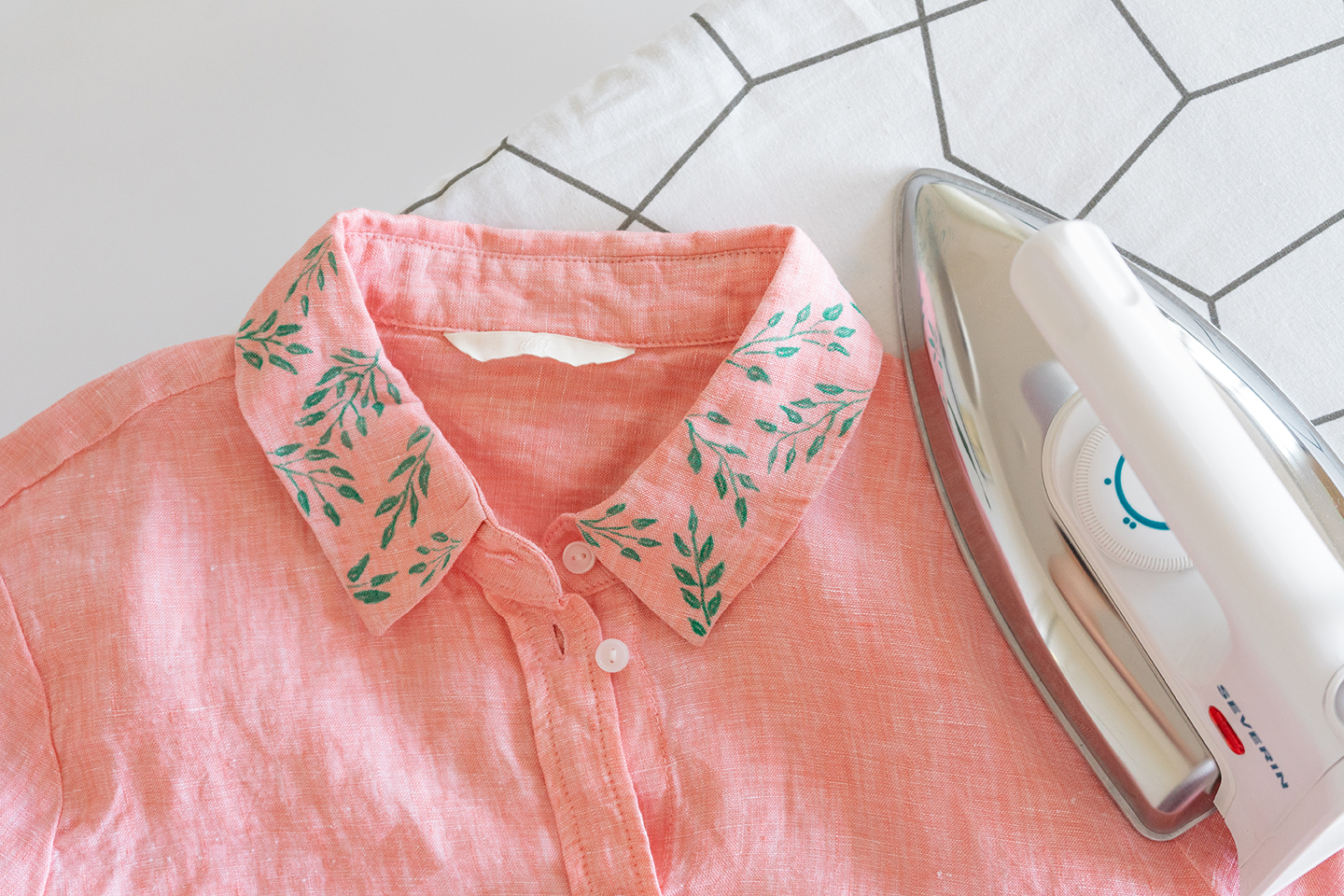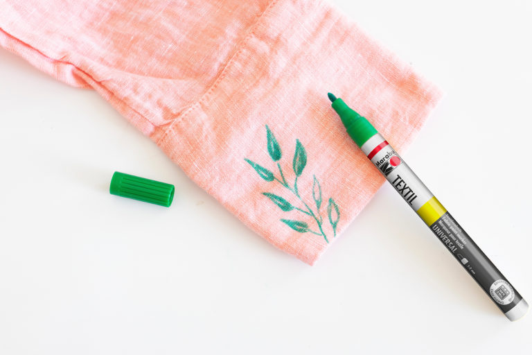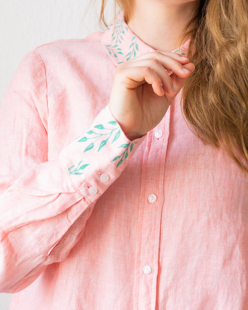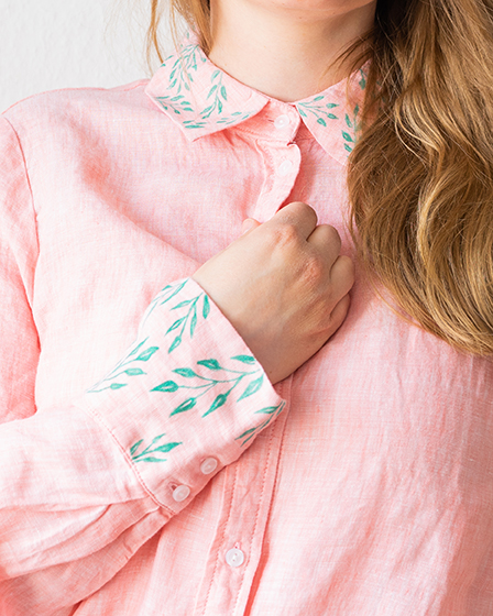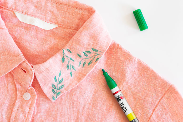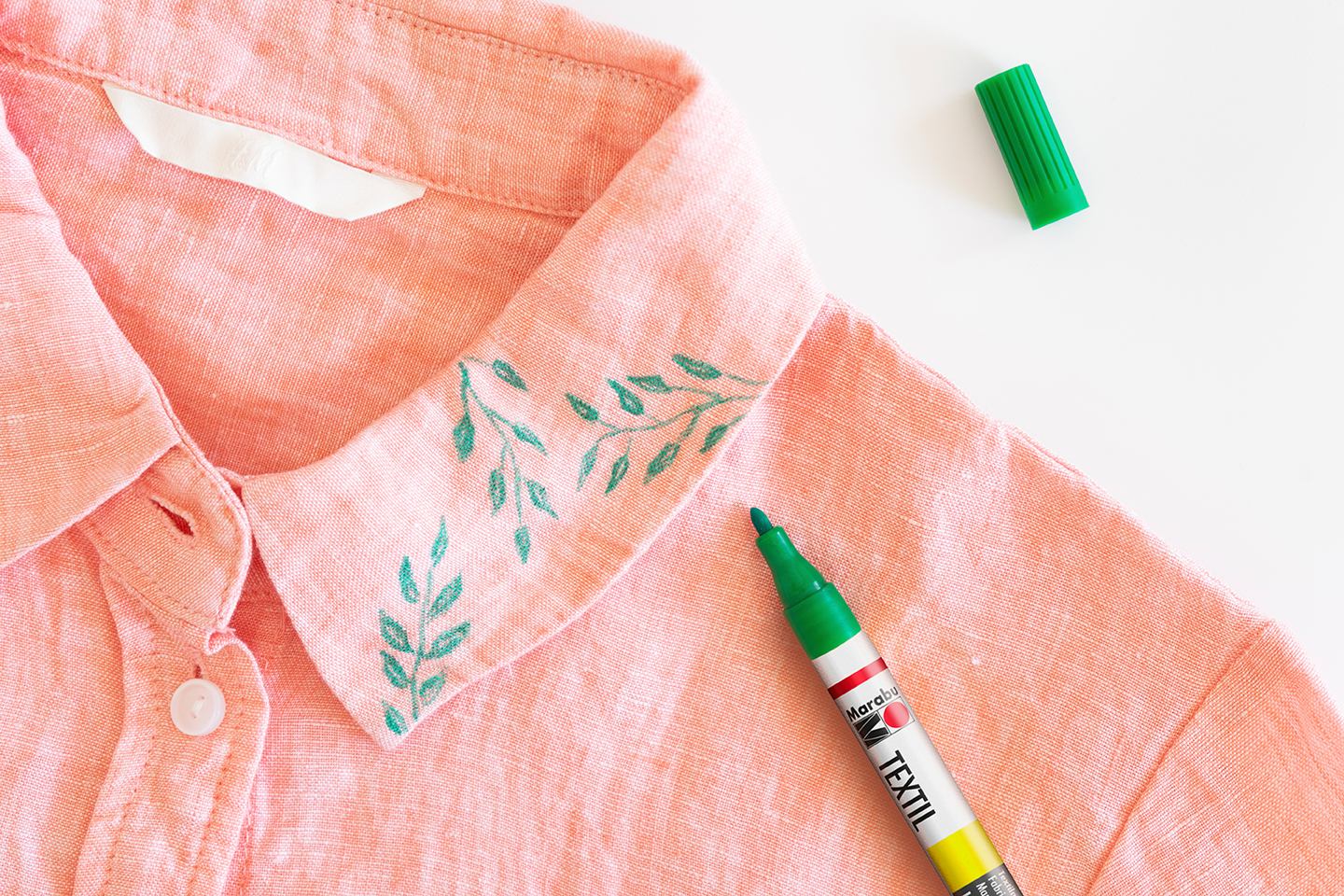 Do you have an item of clothing in your wardrobe that fits you really well and suits you but just isn’t fashionable anymore? Try upcycling it and restyle it to give your old favourite a new, creative lease of life. We upcycled our blouse with a floral vine design. This was really easy and quick using the Marabu Textil Painter!
