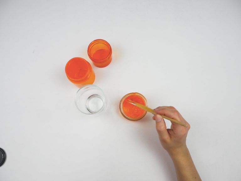 • Use the bristle brush to apply the glass paint evenly to the inside of the glass. Let it dry quickly, then apply a second layer. Allow everything to dry thoroughly.