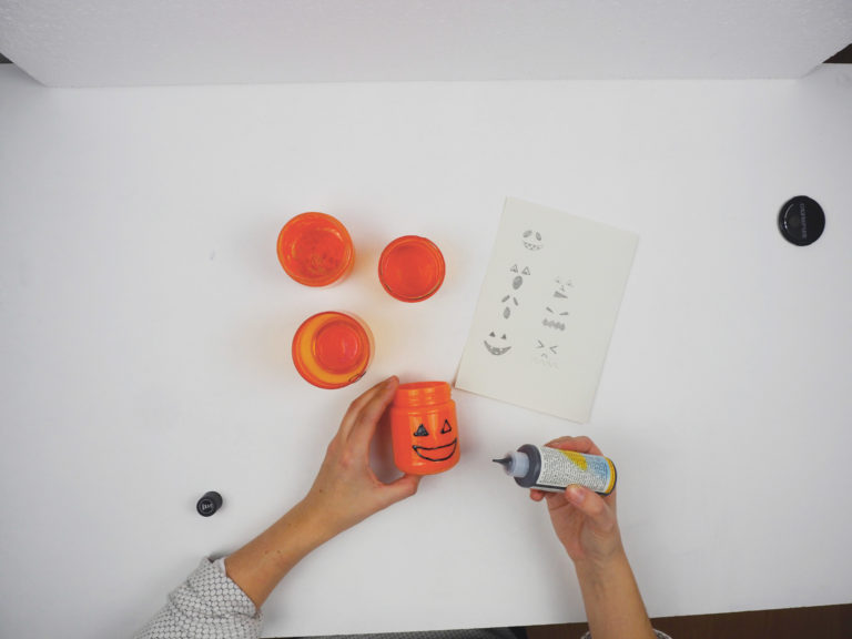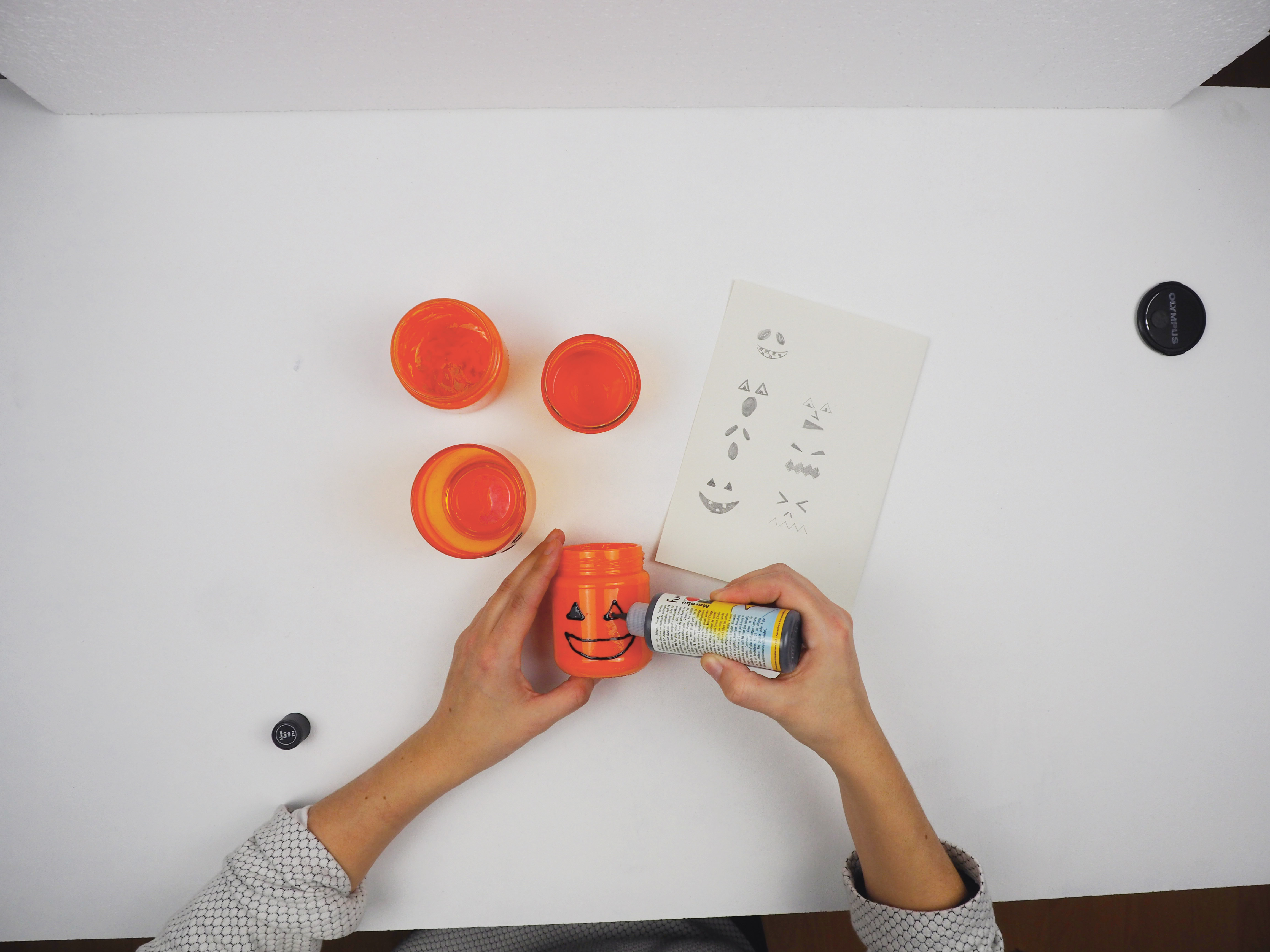 • Make up funny Halloween faces and sketch them out on a piece of paper. Cut out the template, place inside the jar, fix with adhesive tape and paint the outline on the outside of the jar using Window Color. Let it dry; and if you don’t like an outline at a later stage, you can easily peel it off again.
