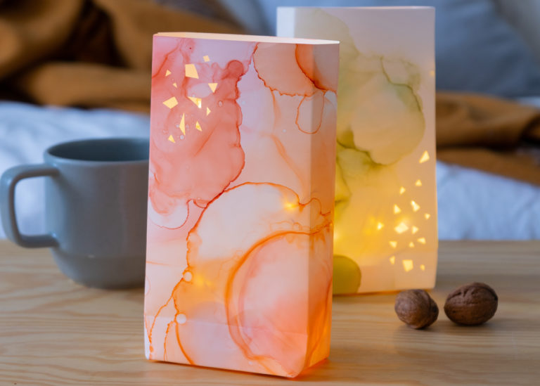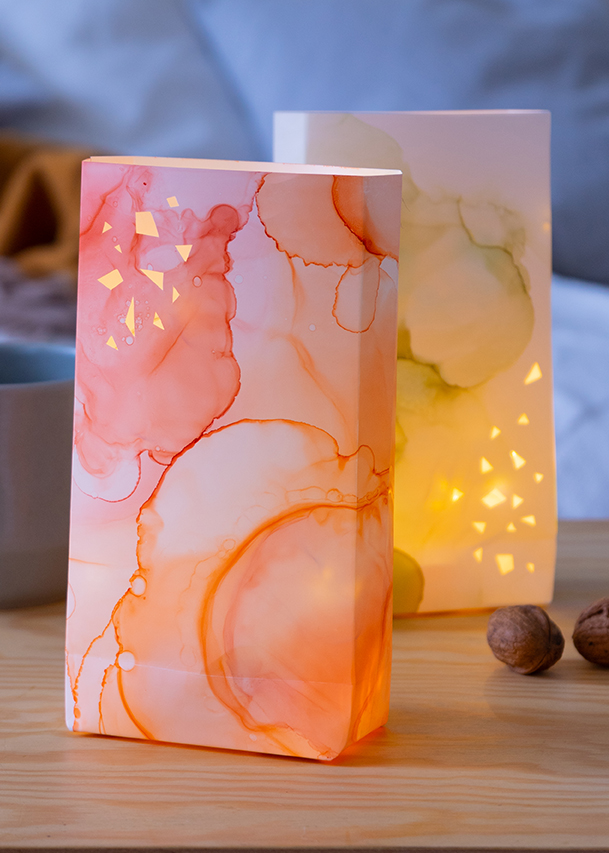 Autumn includes beautiful shades of red and orange as well as candlelight and cosy hours on the couch on wet, cold and dark autumn days. The light bags designed with alcohol ink conjure up a wonderful atmosphere and the cut-out geometric shapes also create fantastic plays of light with the flickering candlelight.