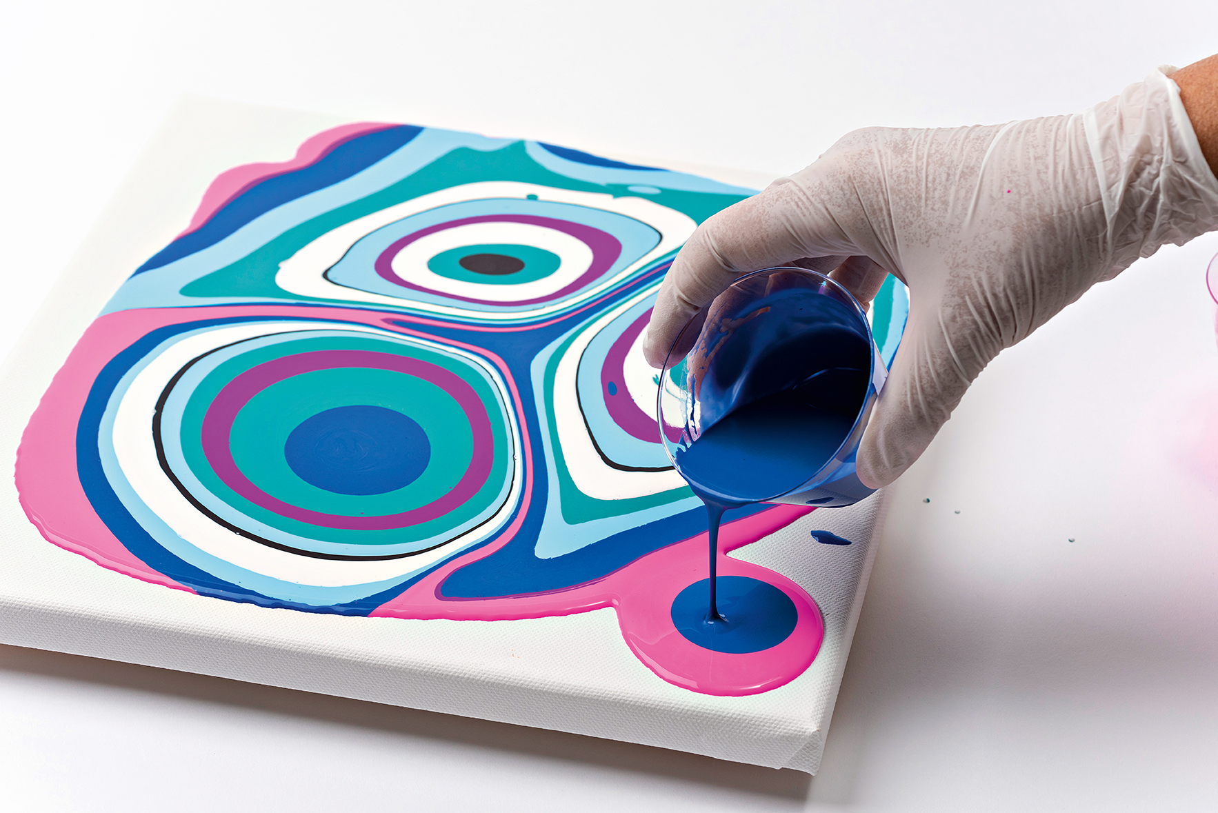 Love powerful patterns and expressive effects? Then try our PUDDLE POUR technique where individual paint colours are poured onto the previous colour one after another.