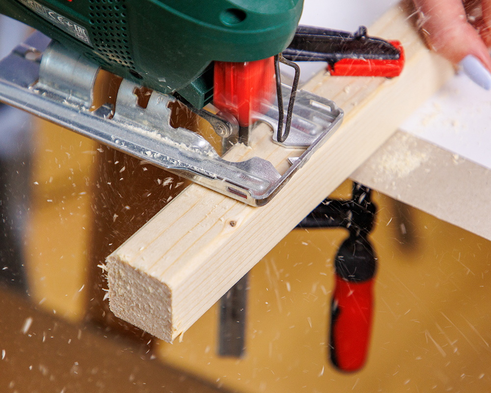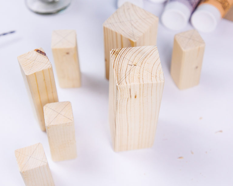 • Shorten the square pieces of wood - if they are not already in the form of blocks of different sizes - using a (jigsaw). They can vary in length between 6 and 12 cm. Sand the edges if necessary.