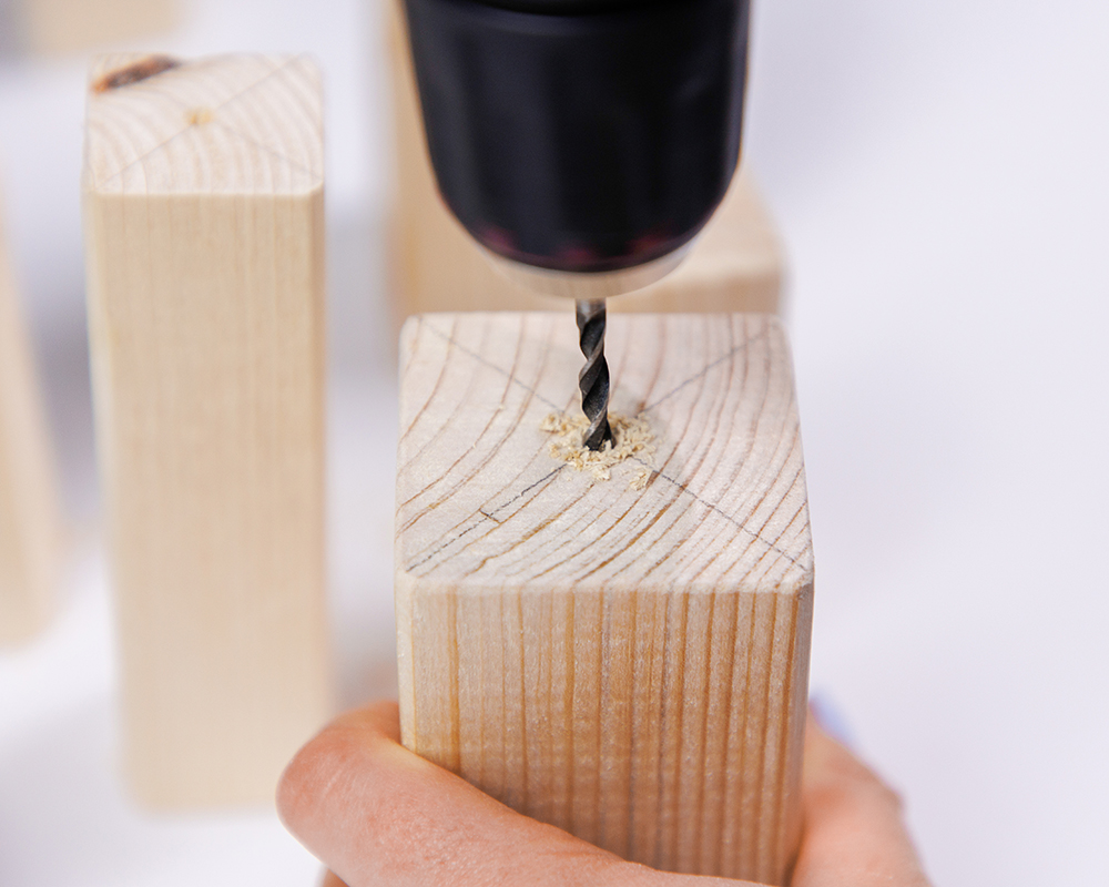 • Drill a hole approx. 3 to 4 cm deep into each block at this intersection using the wood drill, into which the gypsophila can later be inserted.