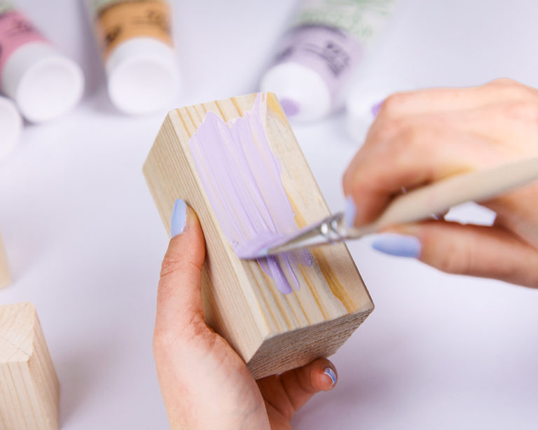 • The blocks can now be primed with Marabu GREEN alkyd paint. Make sure that the surface is dust-free. Two coats of paint ensure an opaque color result. The largest brush from the Marabu GREEN brush set can be used for this. Allow the paint to dry thoroughly.