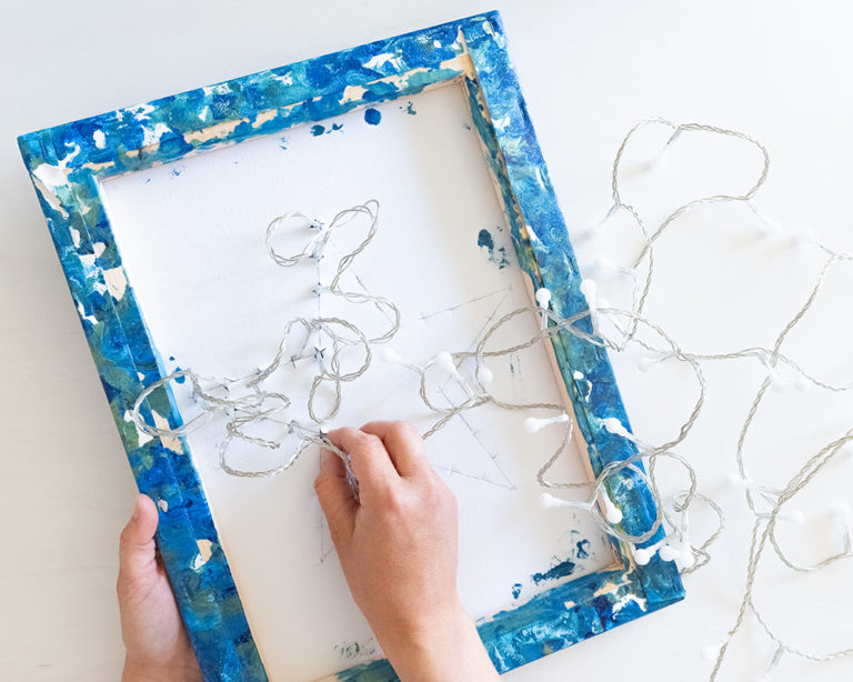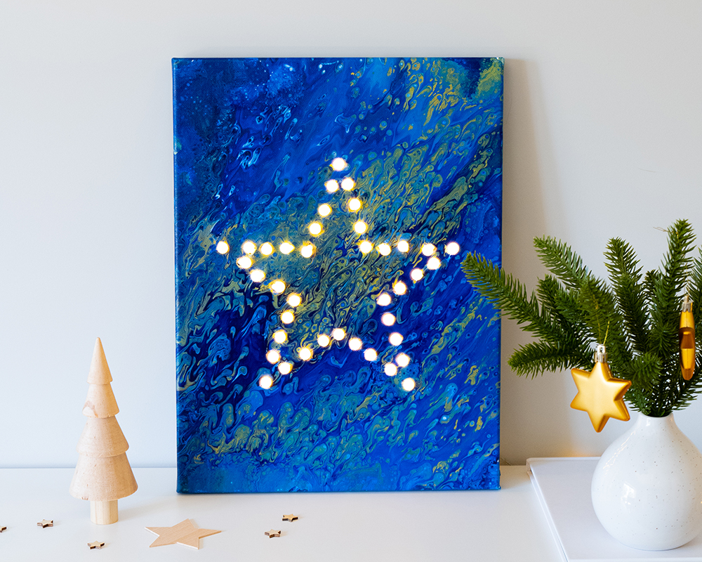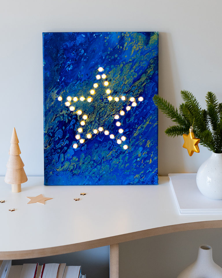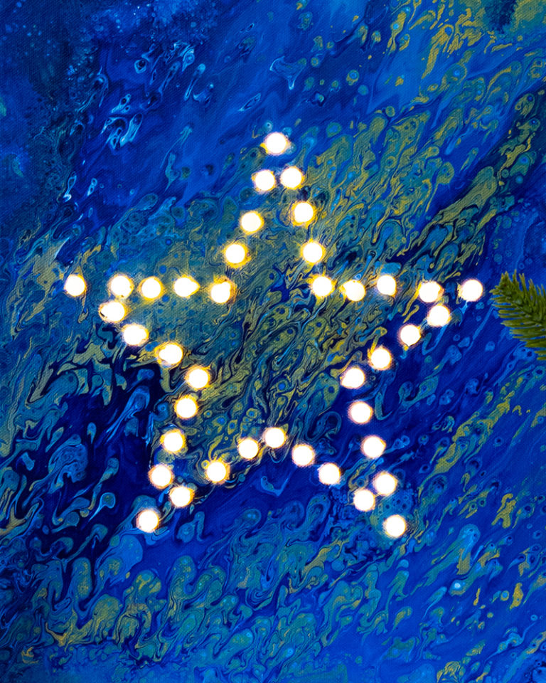 With acrylic pouring, each picture is absolutely unique and creative. With a string of lights as a star, the pouring picture gets a Christmas accent and is an absolute eye-catcher in the Christmas decorations.
