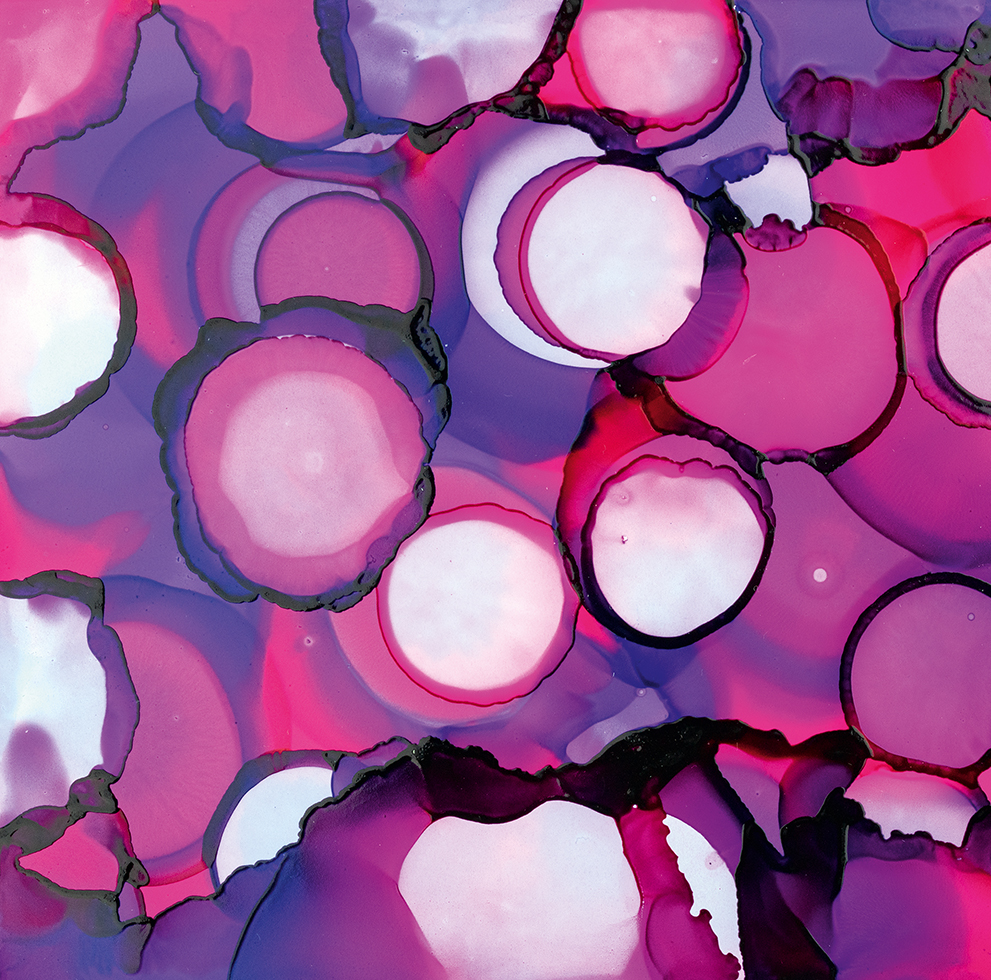 The Alcohol Ink colours are complemented by the Alcohol Ink Extender, which is used to mix, lighten and lift them. It also slows the drying process. The Extender is indispensable for many techniques, for example for creating transparency when using the “wispy layers” technique. Squeezing droplets of Extender into another colour creates a clear circle.