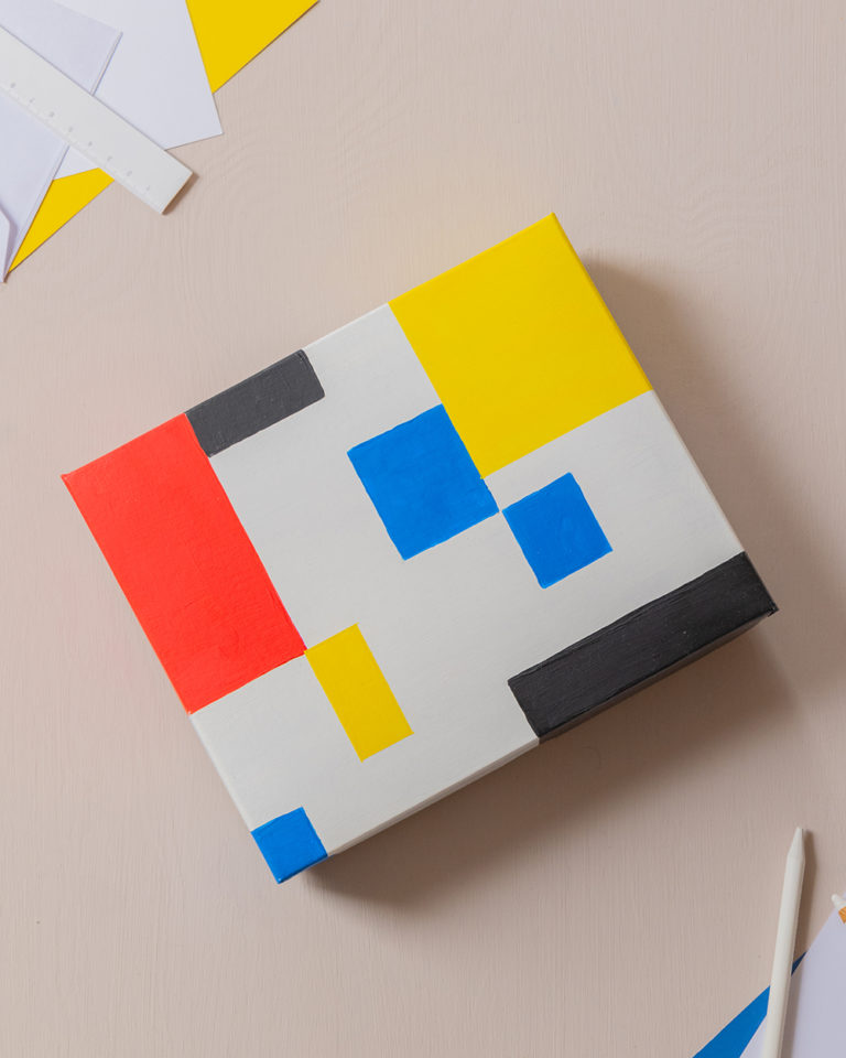 - Ensuite, dessinez des formes géométriques sur le couvercle à l'aide d'un crayon et d'une règle. Les formes ne s'étendent pas seulement sur le dessus, mais aussi sur les côtés.