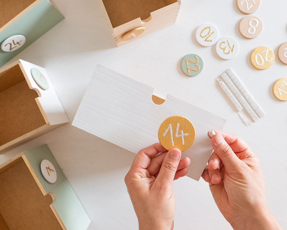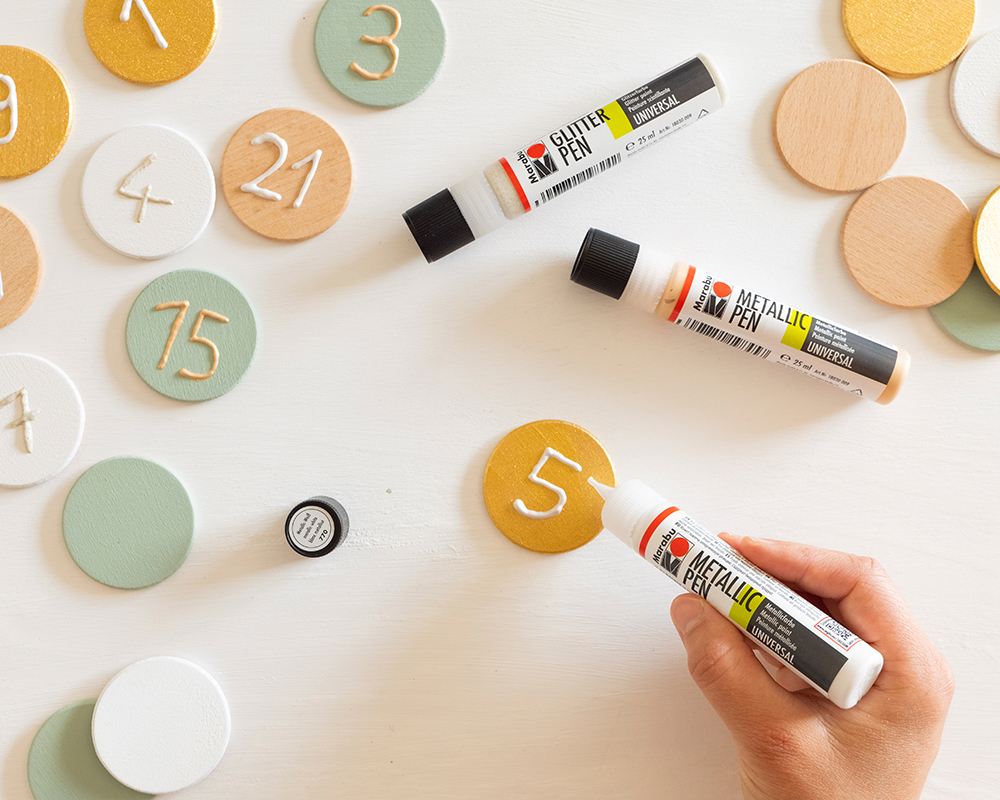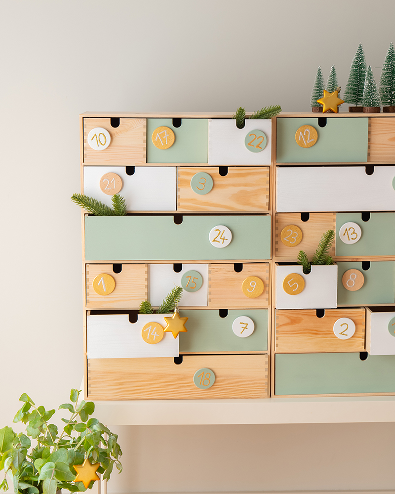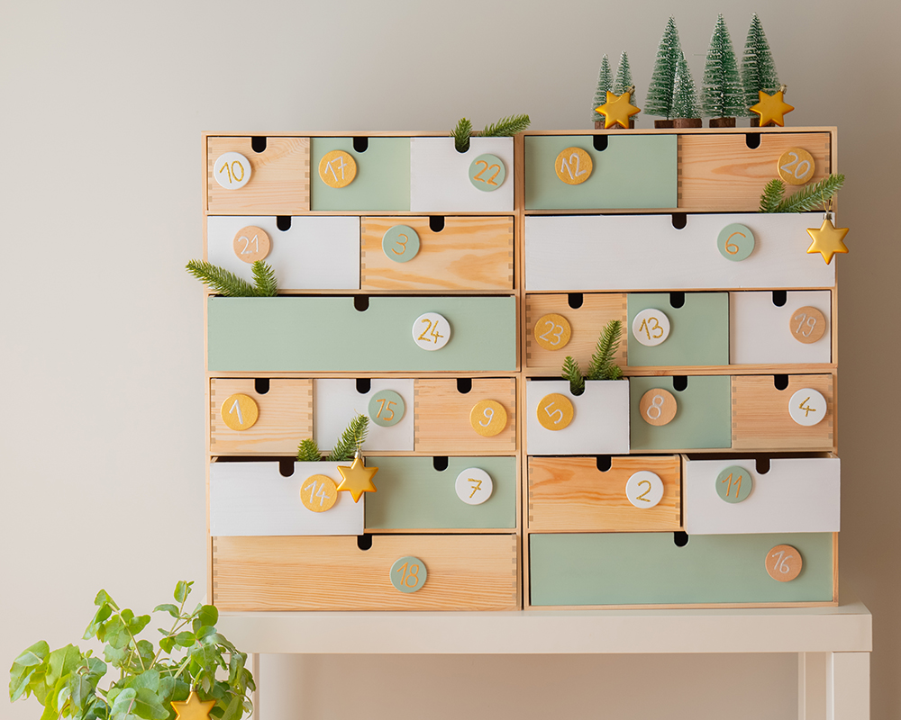 Les nombreux petits tiroirs d’une commode sont parfaits pour cacher des surprises de l’Avent. Avec le Marabu Chalky Chic Spray, le Colorado Gold, les Metallic et Glitter Pens, les tiroirs peuvent être transformés en un superbe calendrier de l’Avent. Et après Noël, la commode peut continuer à être utilisée.