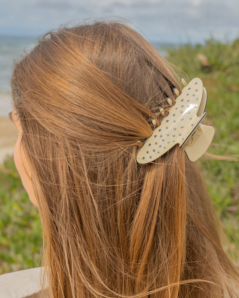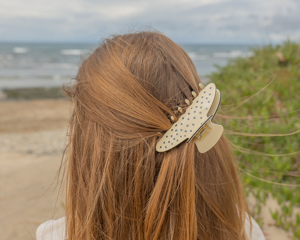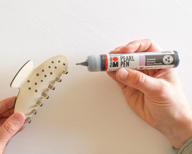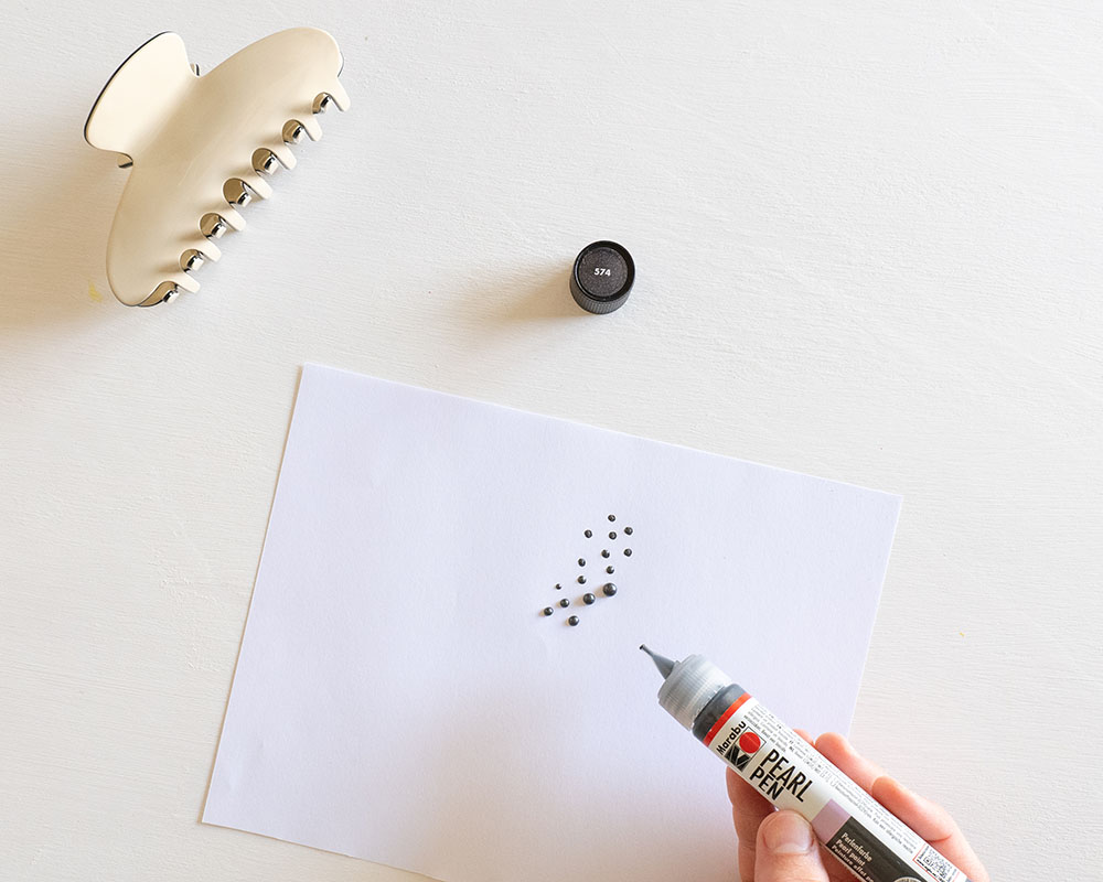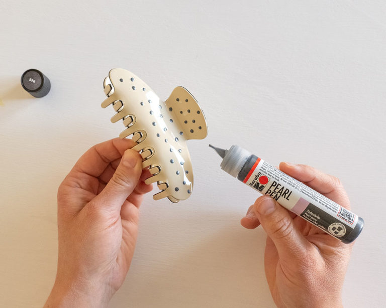Indispensable pour les cheveux longs à la plage – la barrette. Avec de petits points Marabu Pearl Pen appliqués, elle devient incomparable et attire le regard dans chaque coiffure d’été.
