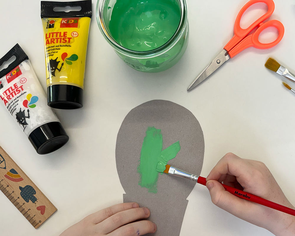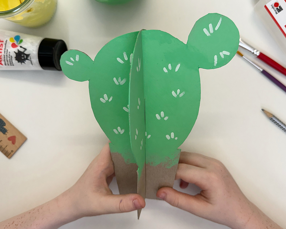 - Peindre le cactus découpé avec Marabu KiDS Little Artist en couvrant la surface. Laisser bien sécher la peinture. Peindre ensuite le dos du cactus en carton.