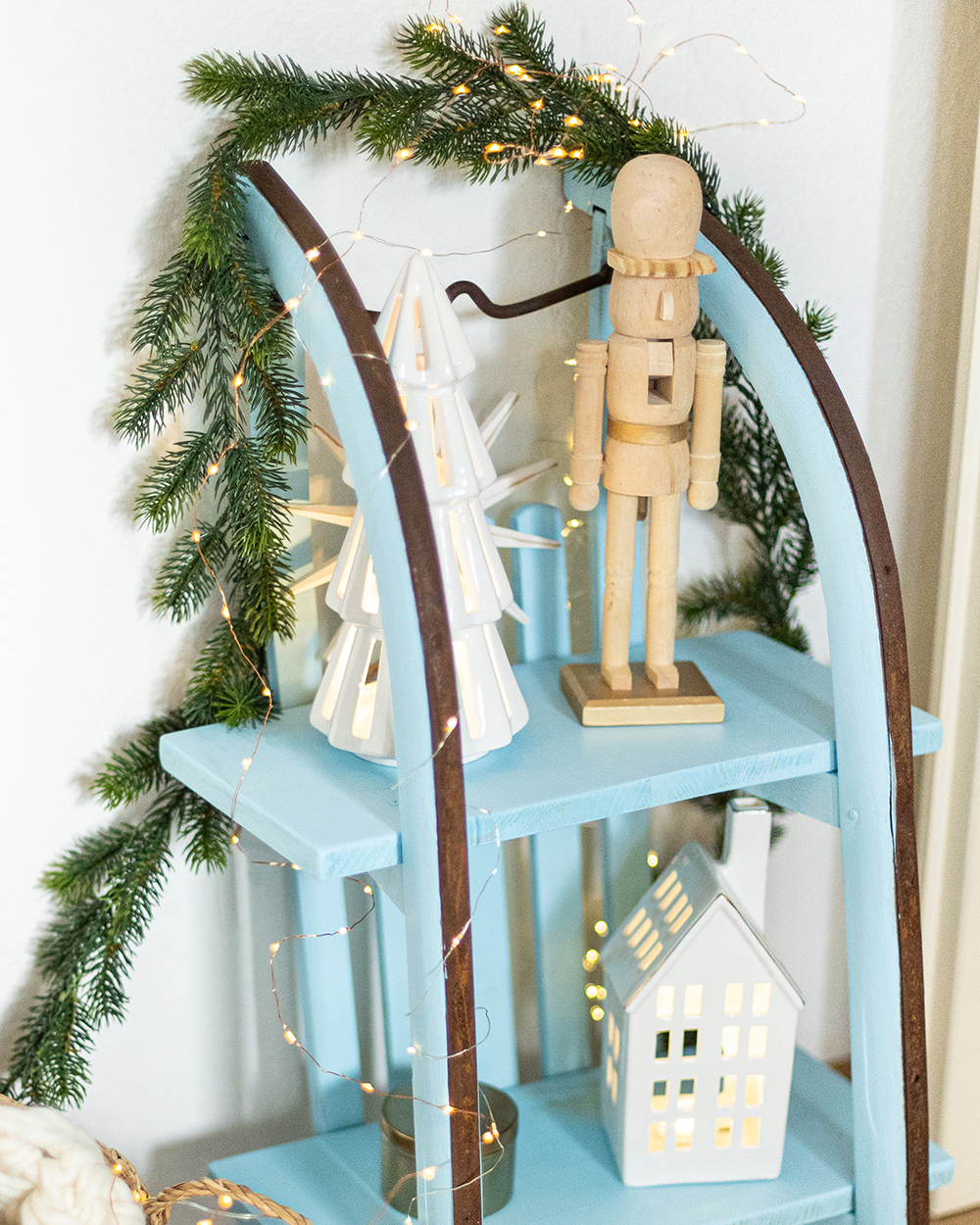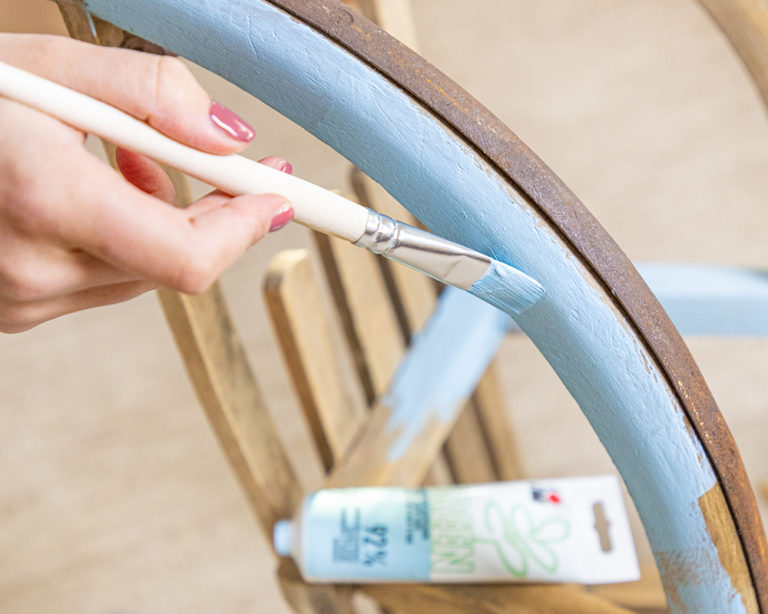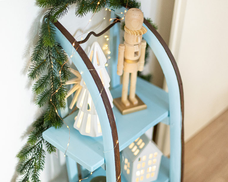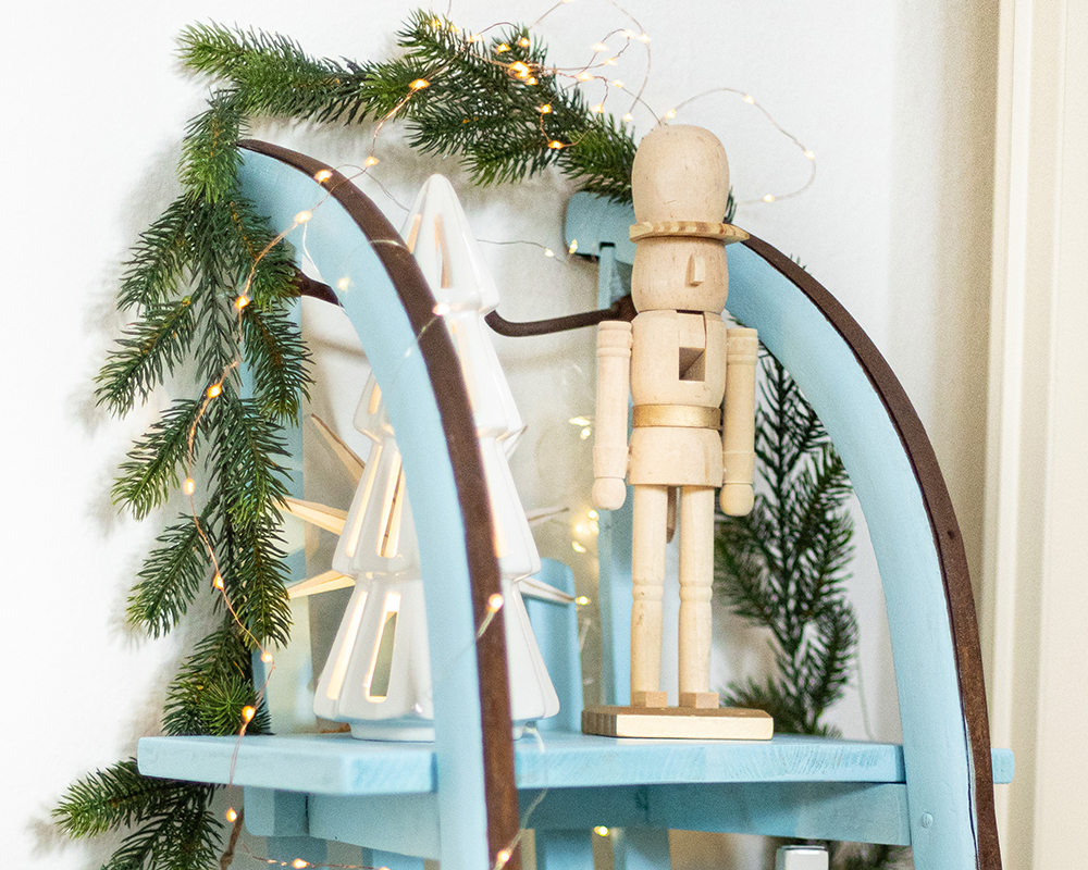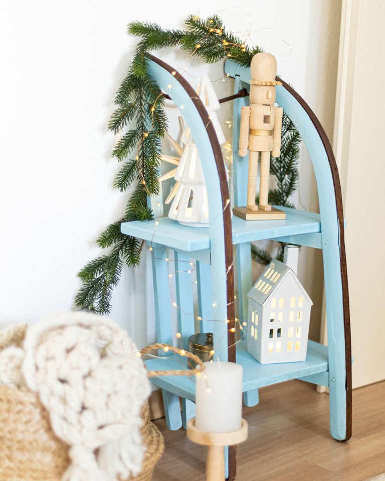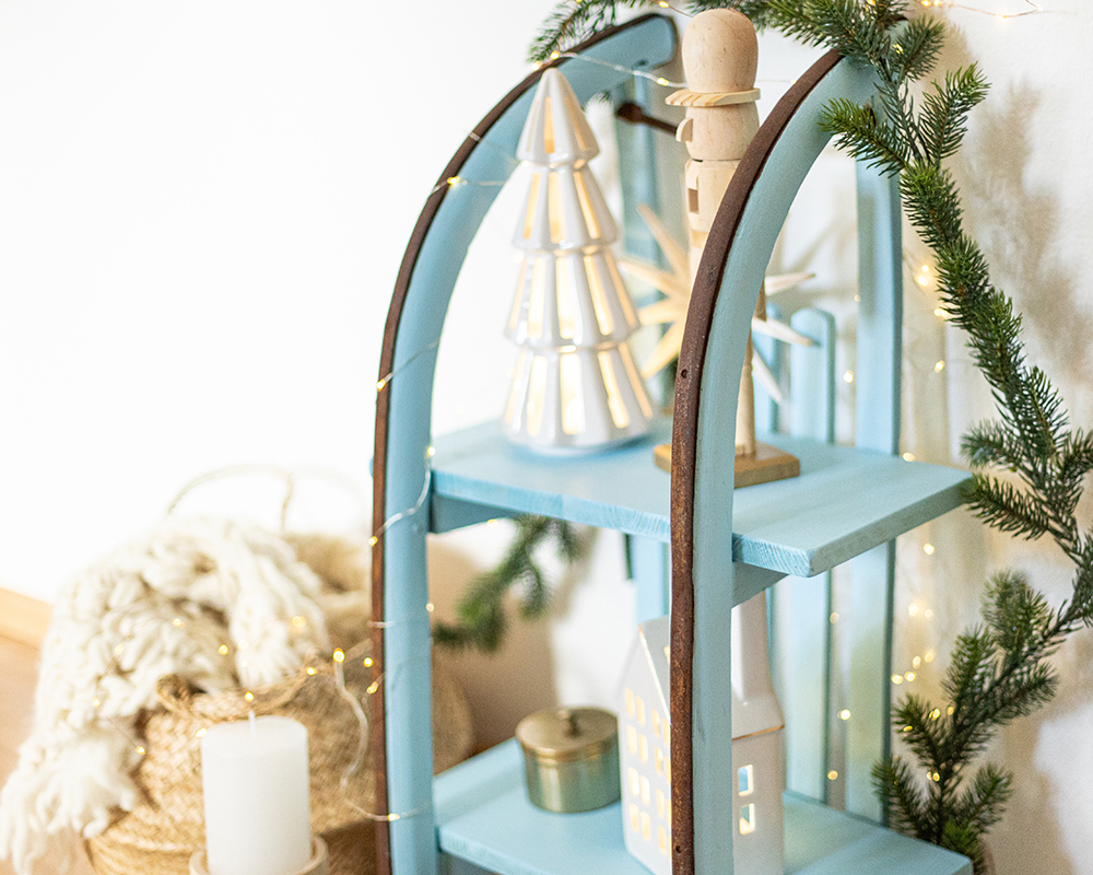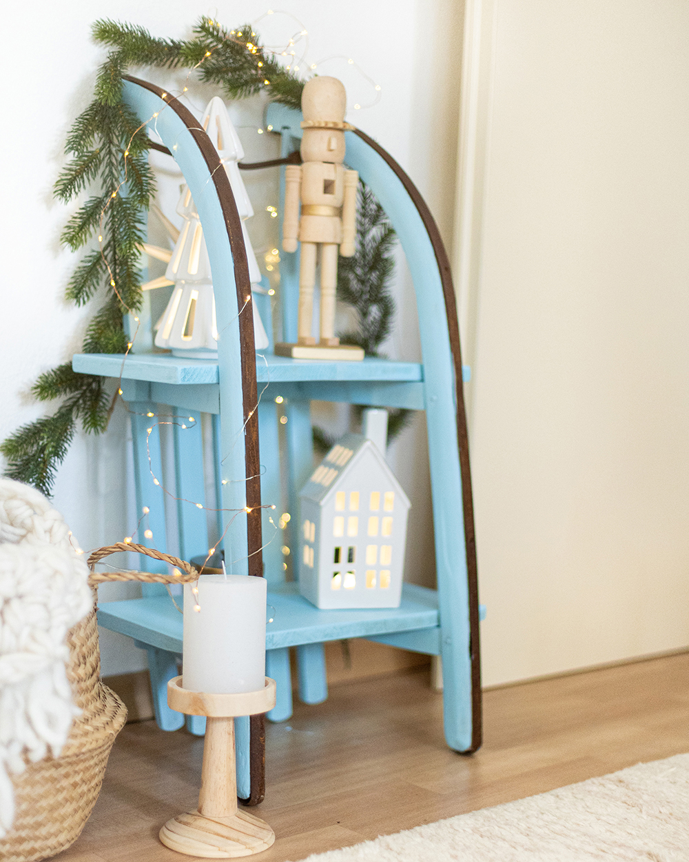 - Peindre le traîneau ainsi que les étagères avec la peinture alkyde GREEN bleu pastel en deux couches. Laisser bien sécher la peinture. Fixer ensuite les étagères sur le traîneau - elles peuvent être simplement posées ou vissées.