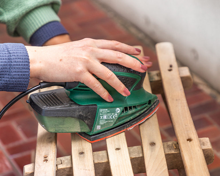 - Poncer le chariot avec une ponceuse ou à la main avec du papier abrasif. Il est préférable de poncer à l'extérieur et de bien couvrir l'environnement de travail au préalable. Nettoyer le chariot de la poussière et des autres impuretés afin de créer une bonne base pour la peinture. Le traîneau doit être propre, sec et exempt de poussière.