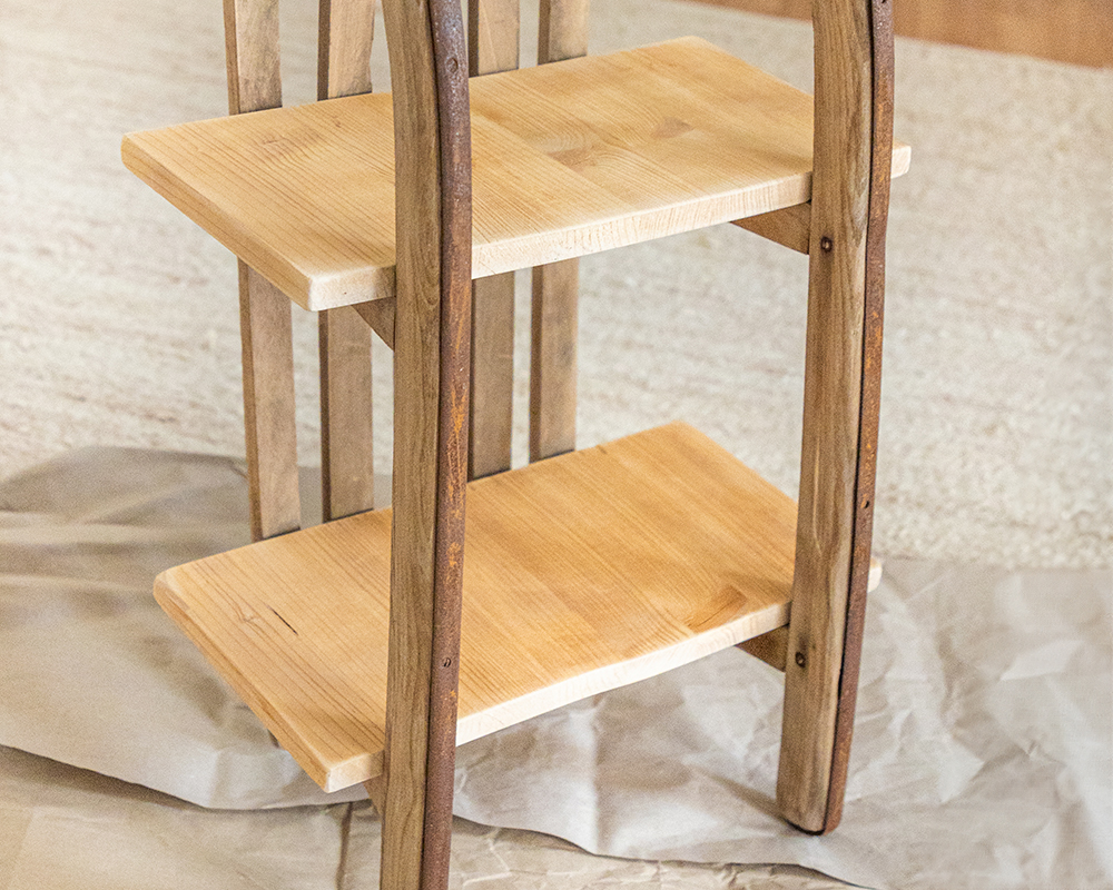 - Découper dans les chutes de bois deux étagères qui s'insèrent exactement entre les traverses du traîneau et les patins. Poncer également les planches de l'étagère et arrondir les bords.