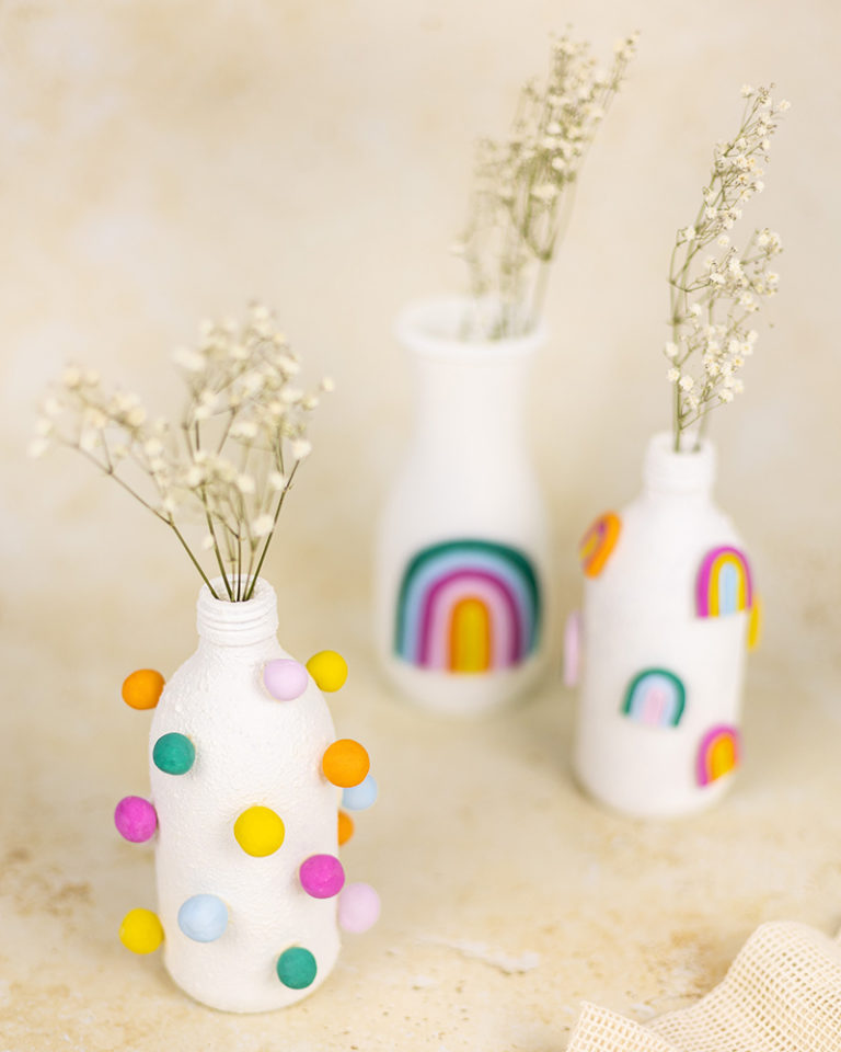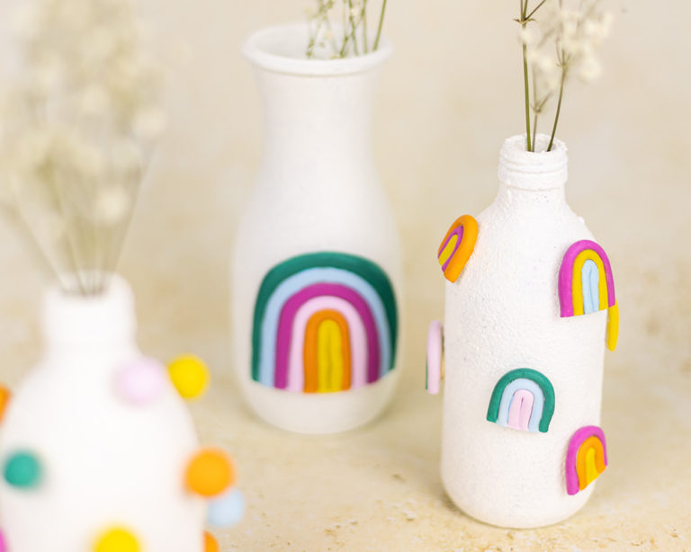 Ces vases avec des ornements colorés en pâte à modeler mettent définitivement de bonne humeur et constituent un superbe projet d’upcycling grâce à l’utilisation de verre recyclé. Si vous n’avez pas de pâte à modeler colorée sous la main, vous pouvez facilement y remédier avec notre peinture alkyde GREEN.
